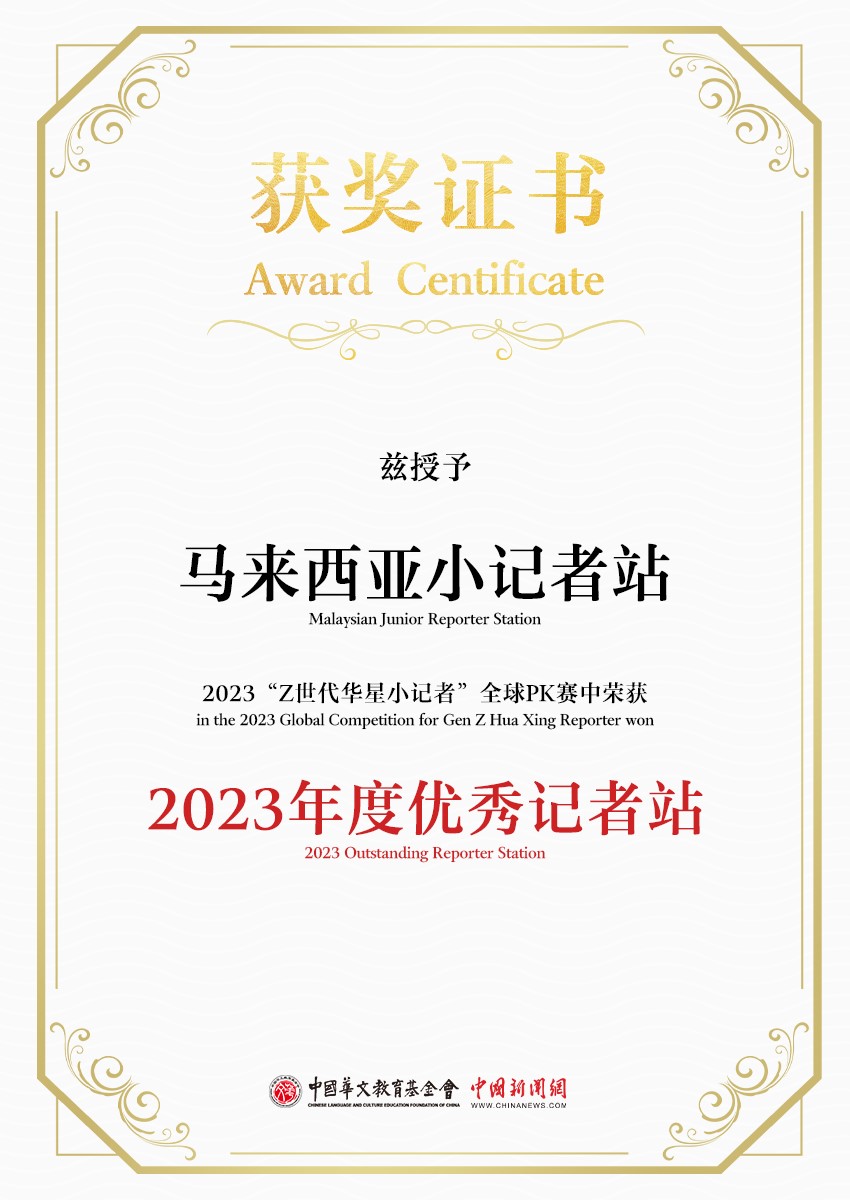 除此之外,综合各小记者站一年来活动组织、作品成果、宣传力度等多方面表现,评选出7家年度优秀记者站。作为马来西亚唯一小记者站的马来西亚华校教师会总会(教总),荣获了“2023年度优秀记者站”奖项。这是全体指导老师牺牲个人时间,积极鼓励和带动学生参与,付出许多努力后获得的成果。因此,教总也要特别感谢指导老师的无私付出,促成了此项活动,并取得了优越的成绩。