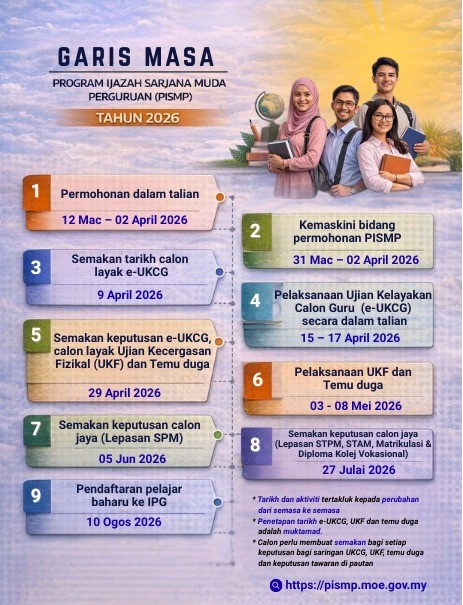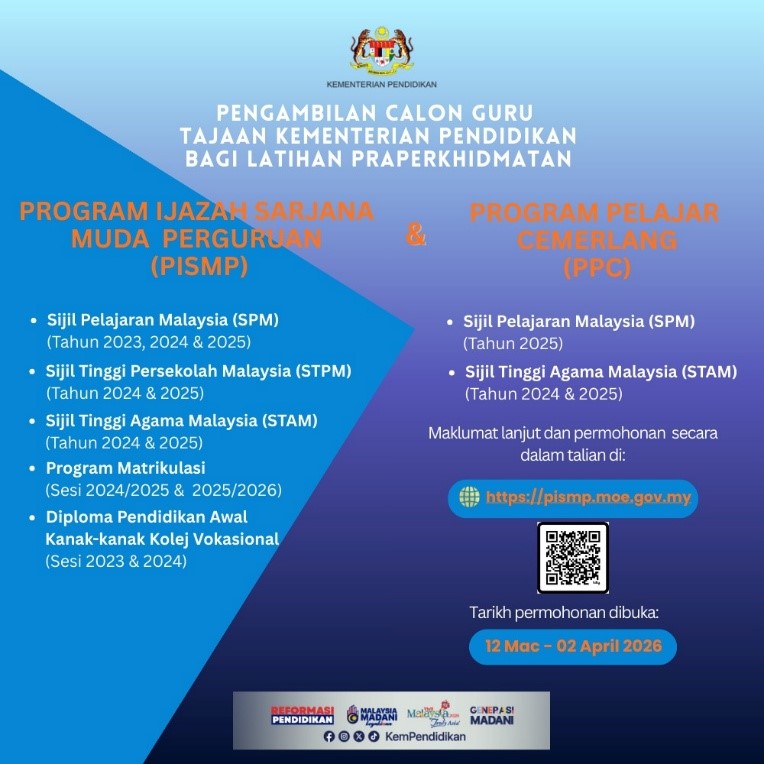 教育部将于 3月12日至4月2日 开放招收 2026年教师学士课程(PISMP) 和 统考教师学士课程(PISMP-UEC) 新学员。