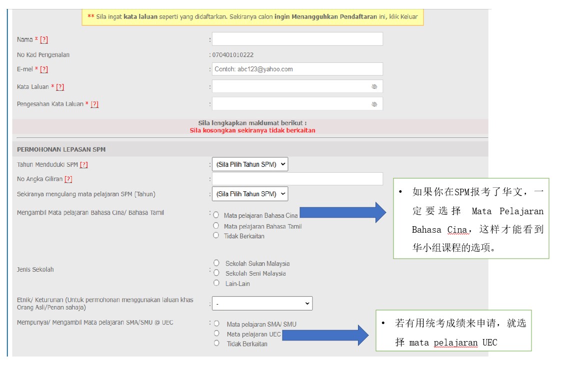 申请时无需填写SPM成绩,只需填写参加SPM考试的年份及考试编号(Angka Giliran)即可。