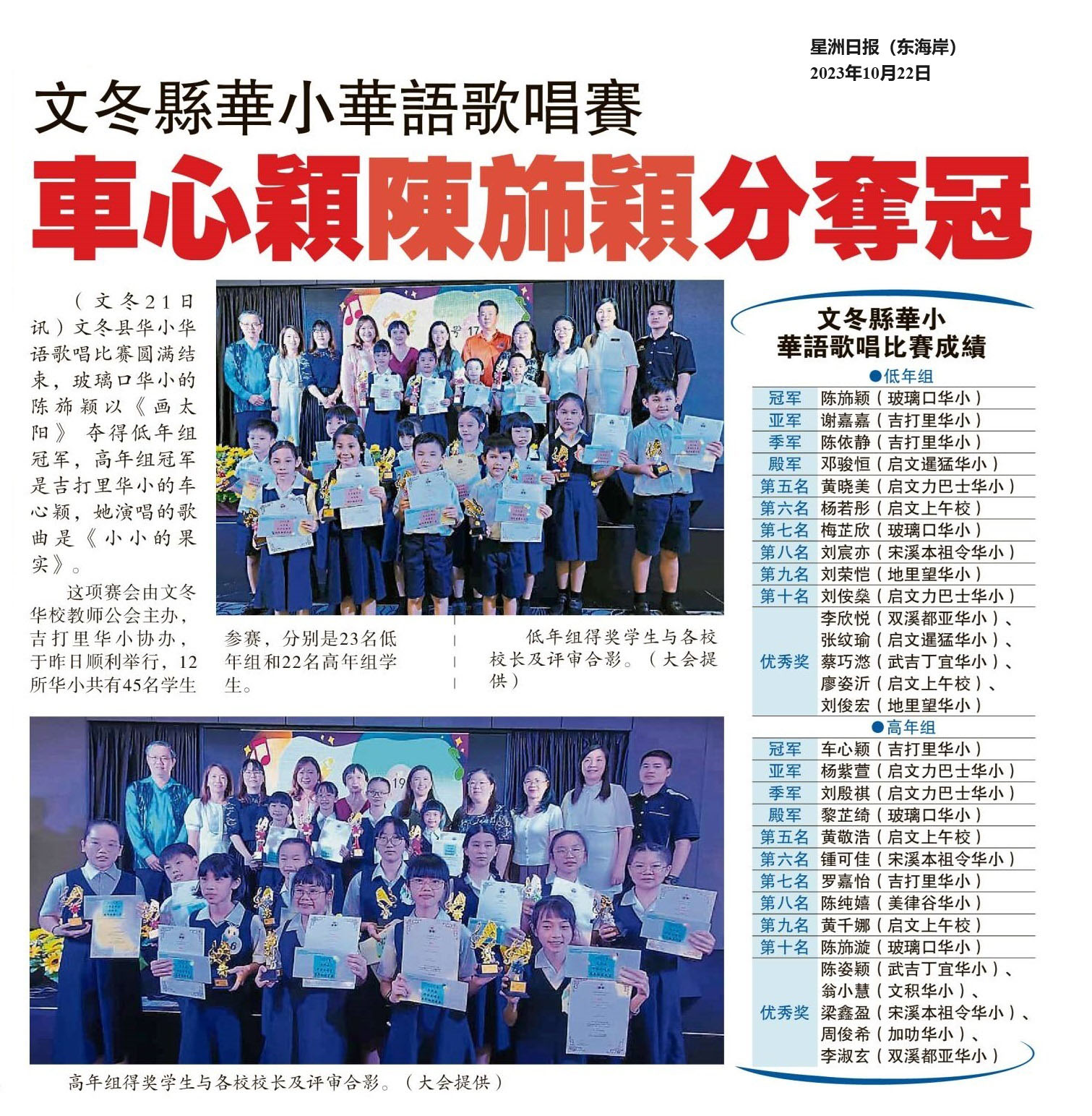 文冬县华小华语歌唱赛 车心颖 陈旆颖分夺冠