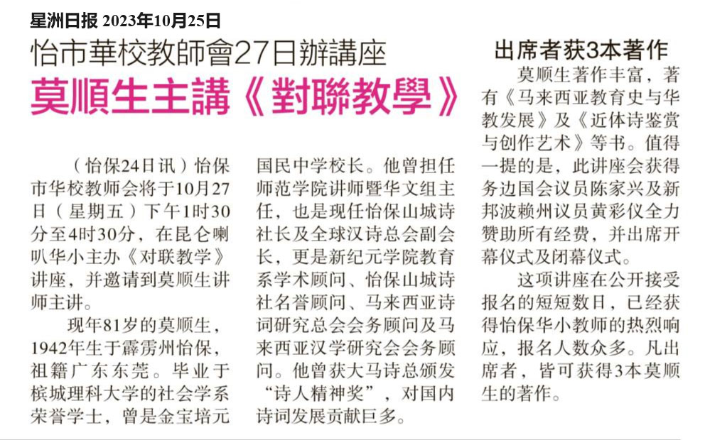 怡市华校教师会27日办讲座 莫顺生主讲《对联教学》