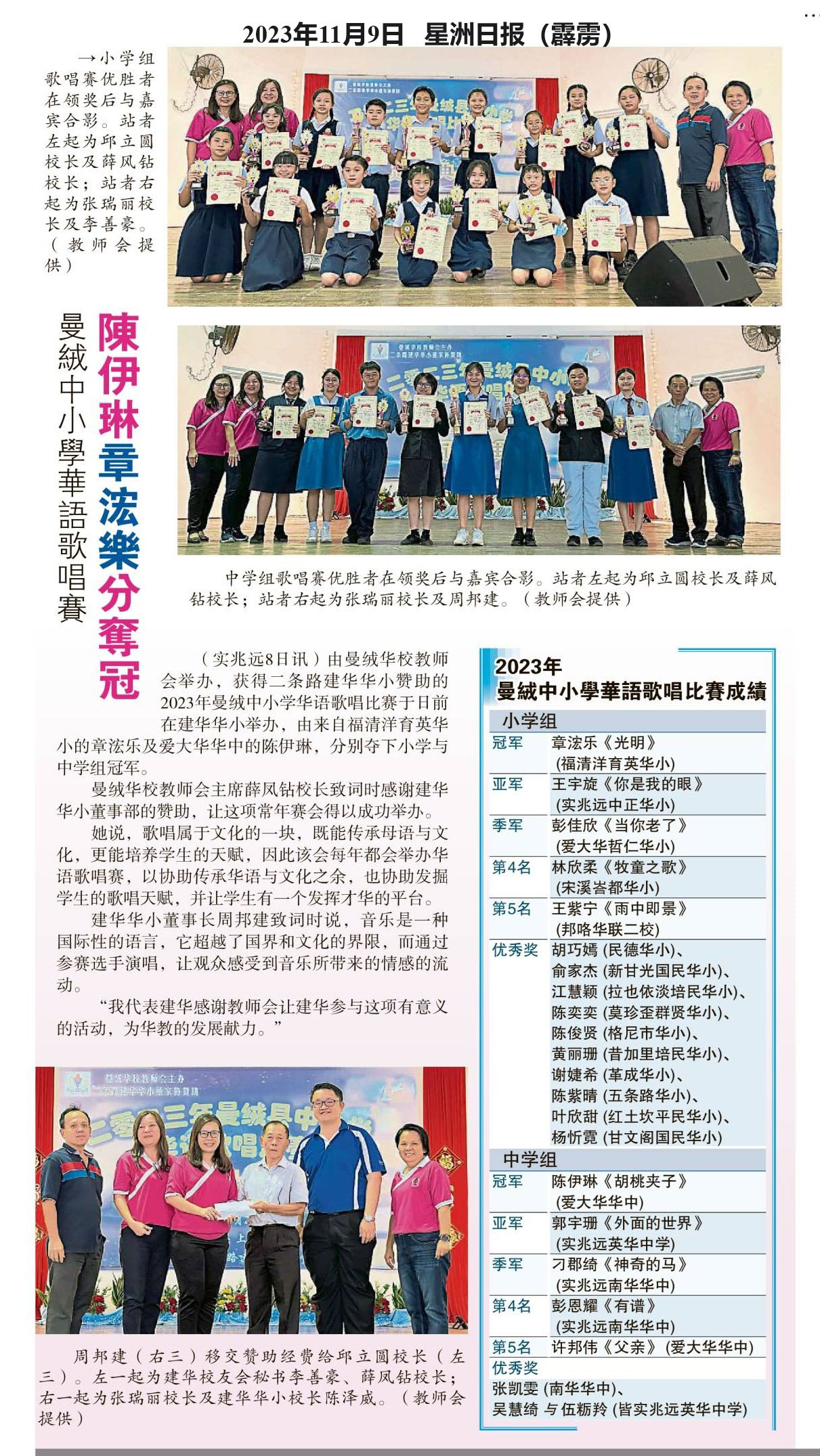 曼绒中小学华语歌唱赛 陈伊琳 章浤乐分夺冠