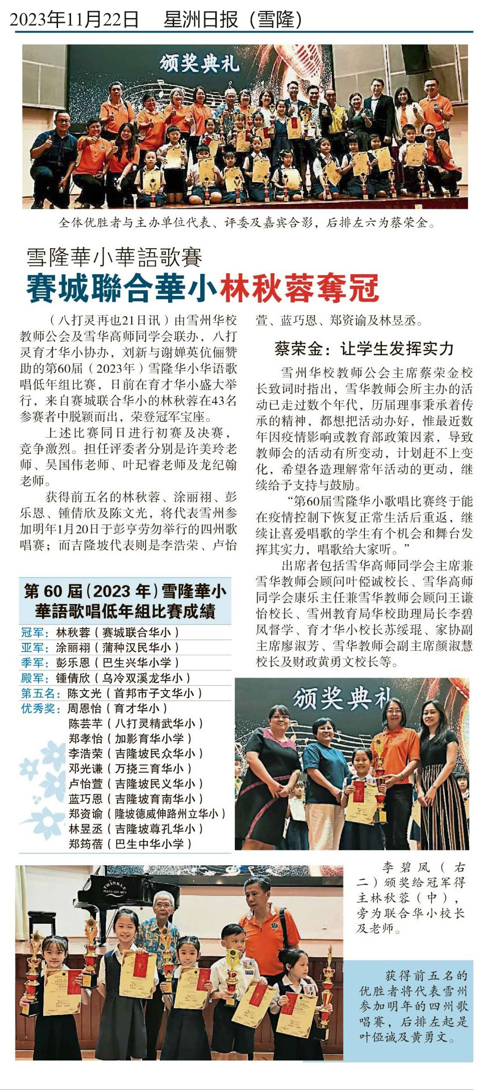 雪隆华小华语歌唱赛 赛城联合华小林秋蓉夺冠