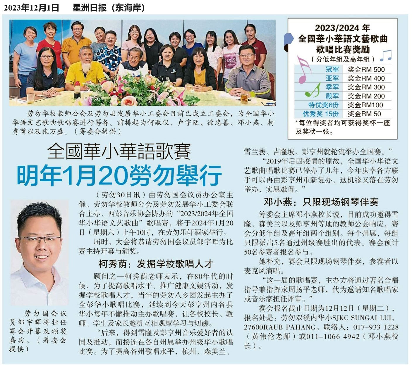 全国华小华语歌唱赛 明年1月20日劳勿举行