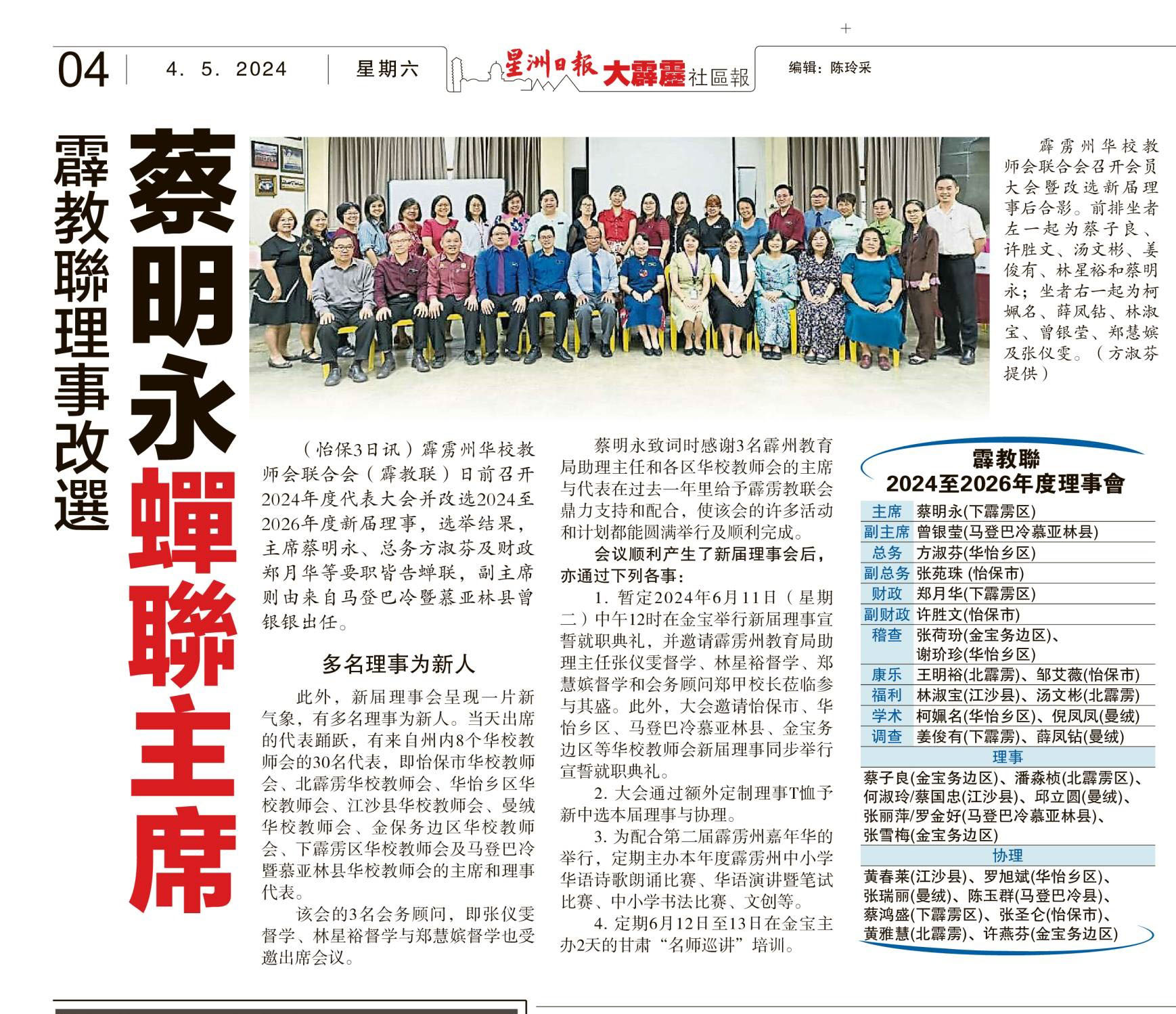 霹教联理事改选 蔡明永蝉联主席