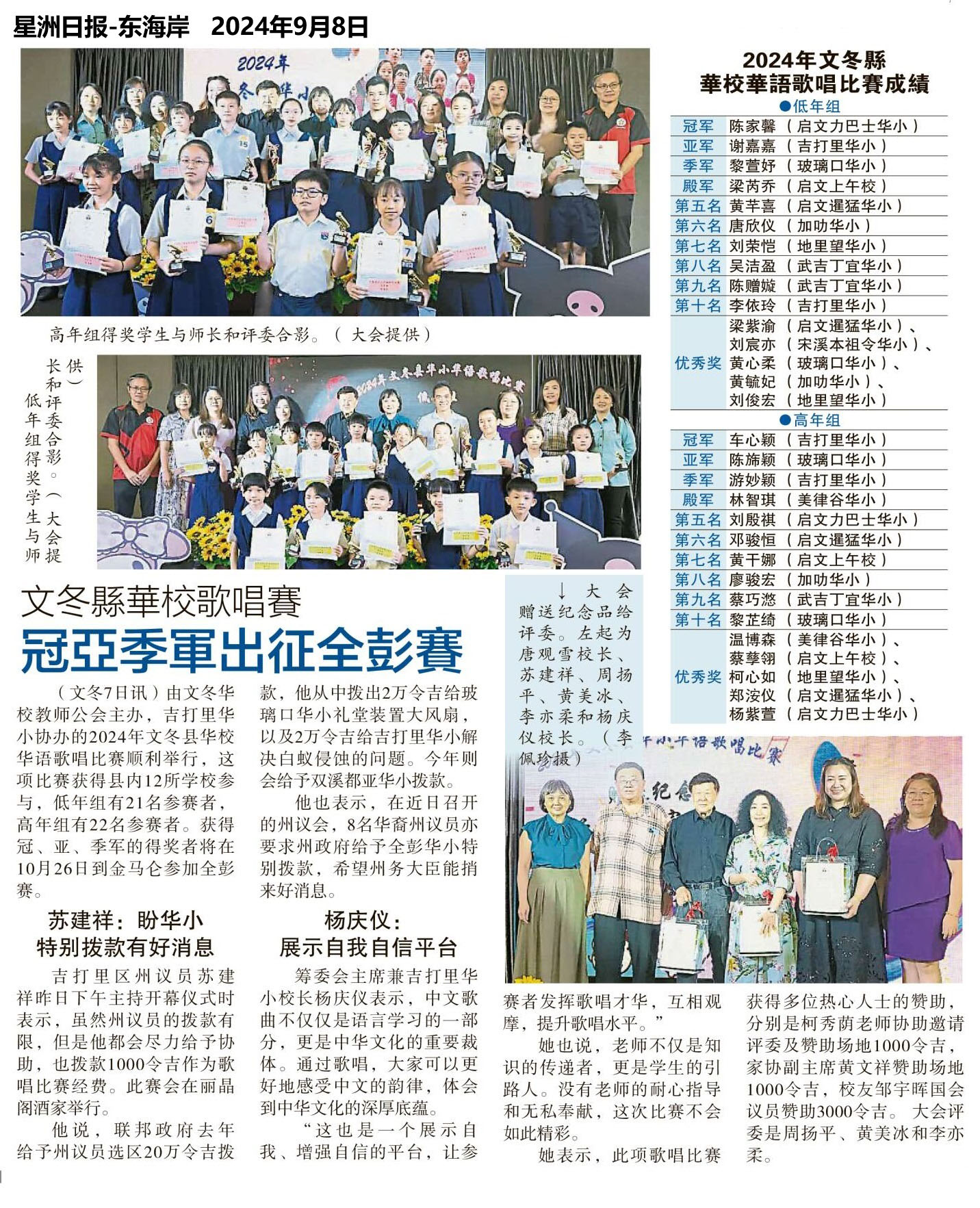 文冬县华校歌唱赛 冠亚季军出征全彭赛
