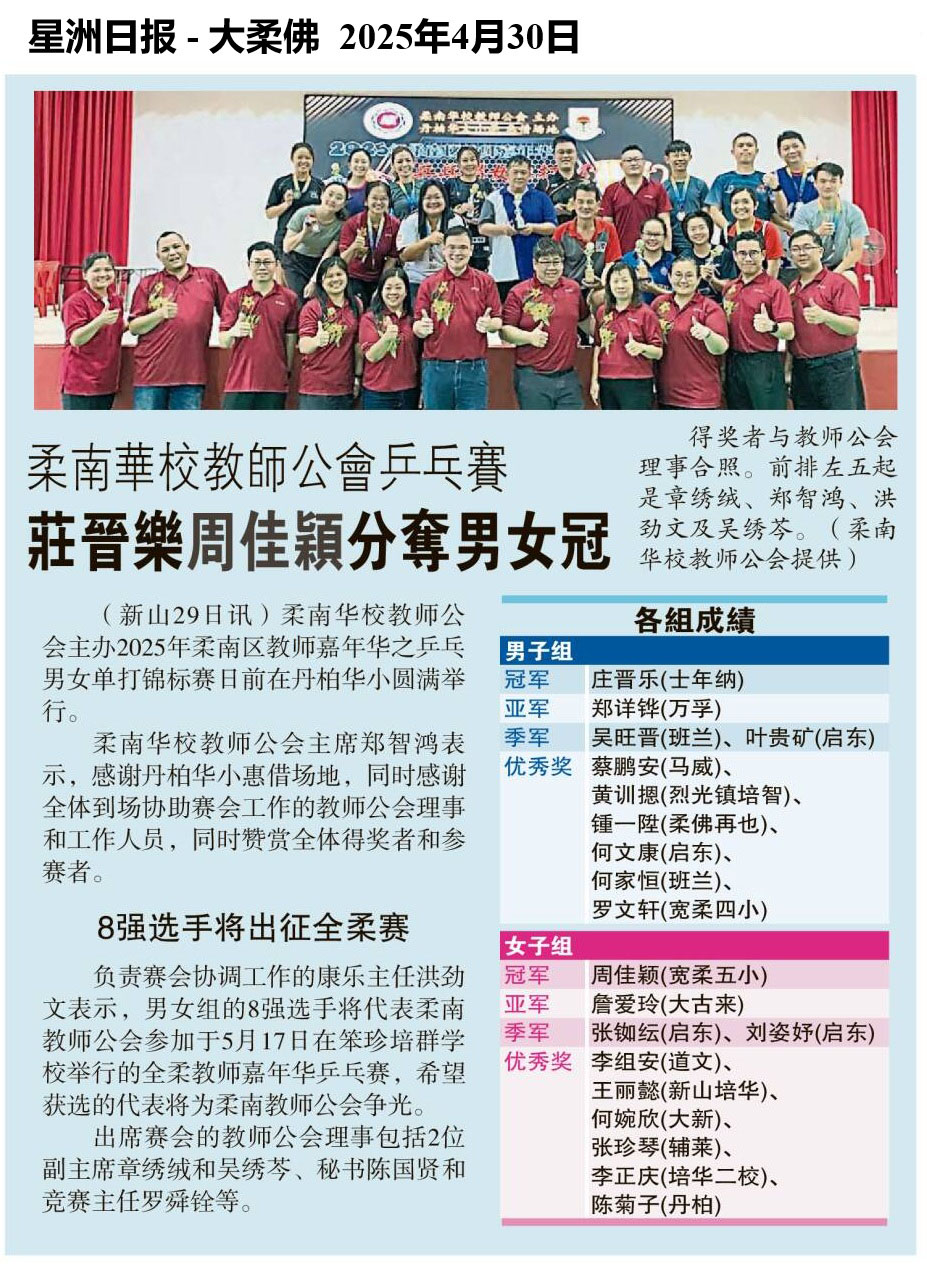 柔南华校教师公会兵乓赛 庄晋乐周佳颖分夺男女冠