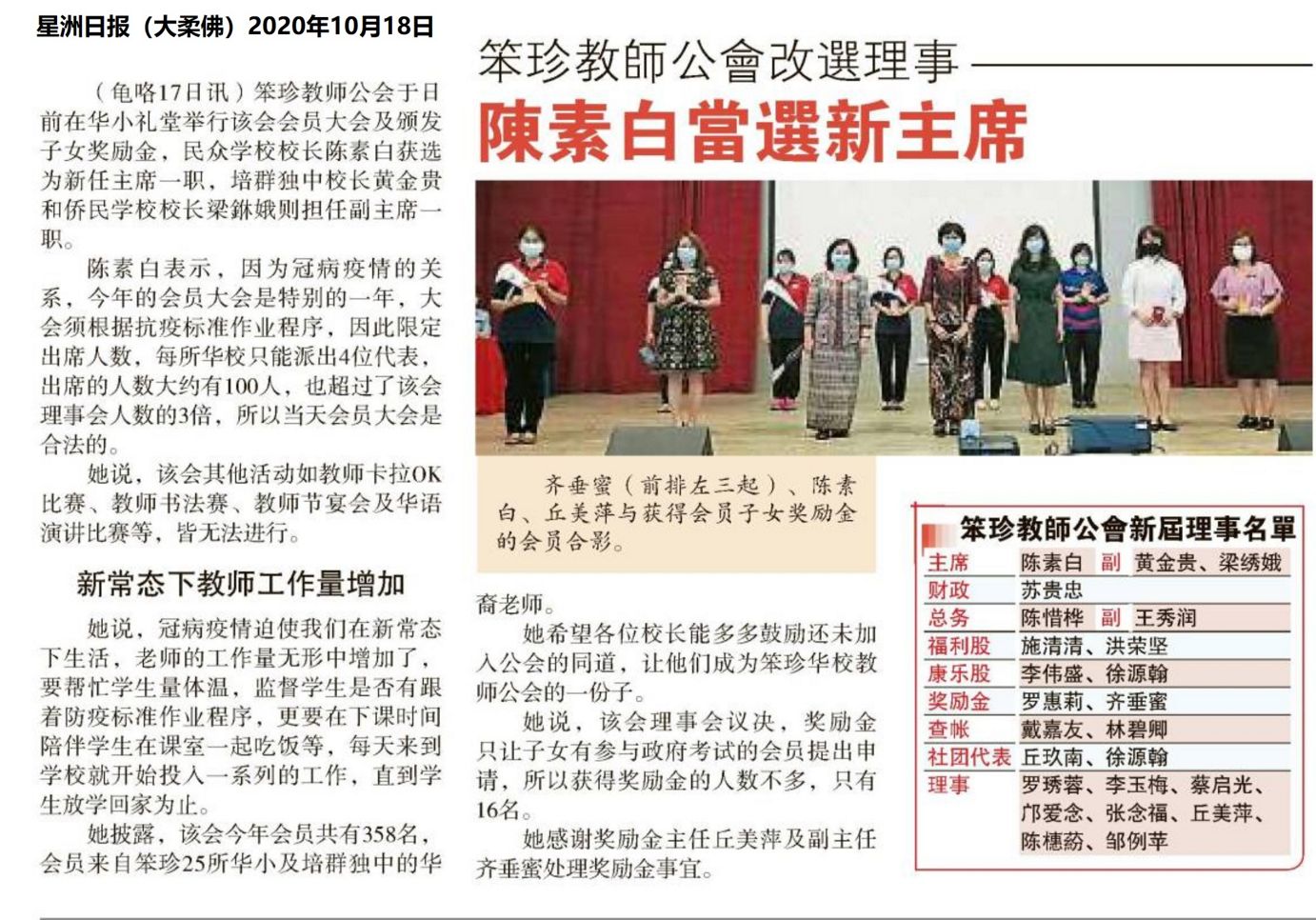 笨珍教师公会改选理事 陈素白当选新主席