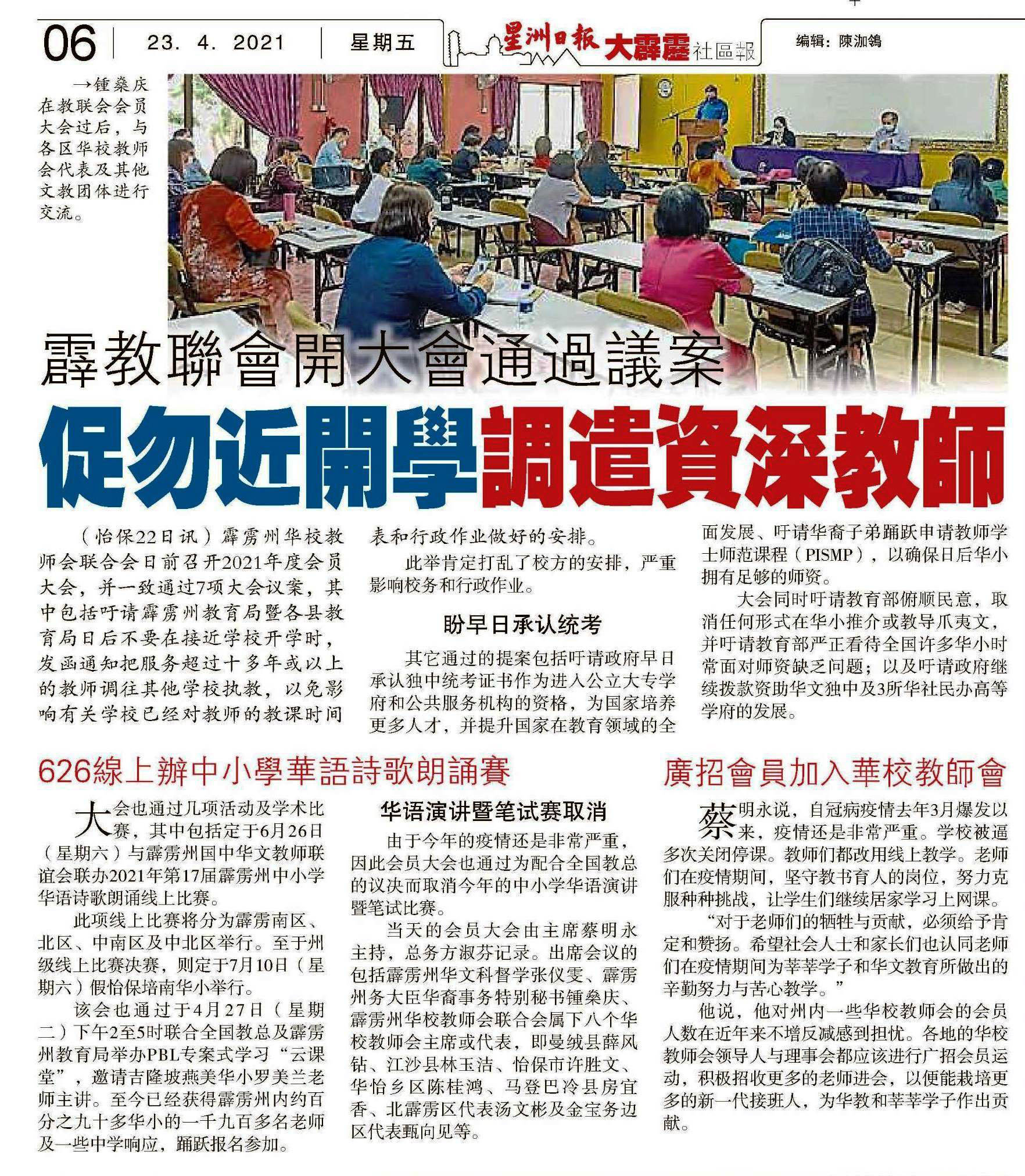 霹雳教联会开大会通过议案 促勿近开学调遣资深教师