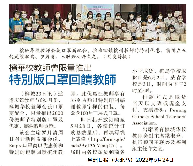 槟华校教师会限量推出 特别版口罩回馈教师 WhatsApp 上一篇文章: 雪州华小200空缺待填 急需体育美术及辅导老师 上一页 下一篇文章: 蔡明永:师资短缺 教师辞职 盼教育部寻方案解2问题 下一页
