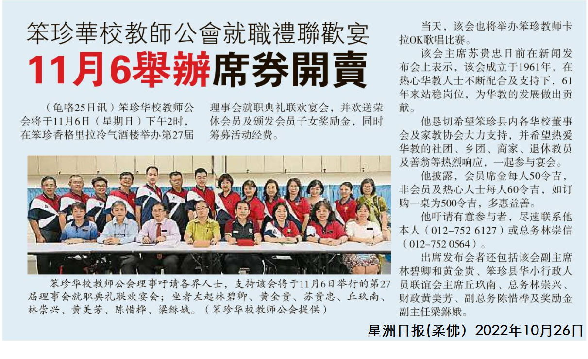 笨珍华校教师公会就职礼联欢宴 11月6举办席券开卖 WhatsApp 上一篇文章: 波杰杯吉北区华小兵乓赛 吉华S校夺4冠大赢家 上一页 下一篇文章: 诗巫华校教师会通过9提案 吁强化多源流教育制度 下一页