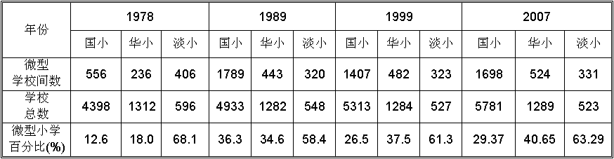 根据教育部的规定,学生人数少过150人的学校就被归为微型学校。各源流小学在某些特定的地区都会面对学生人数稀少的问题,表(一)显示,从1978年至2007年,各源流微型小学间数都有增加的趋势。