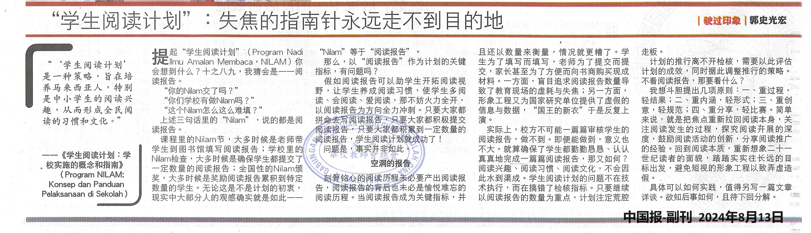 郭史光宏:“学生阅读计划”:失焦的指南针永远走不到目的地 WhatsApp 上一篇文章: 安焕然教授.华教就只是母语教育吗 上一页 下一篇文章: 教育部“零拒收政策”:让每个特殊孩子都能参与学习课堂 下一页