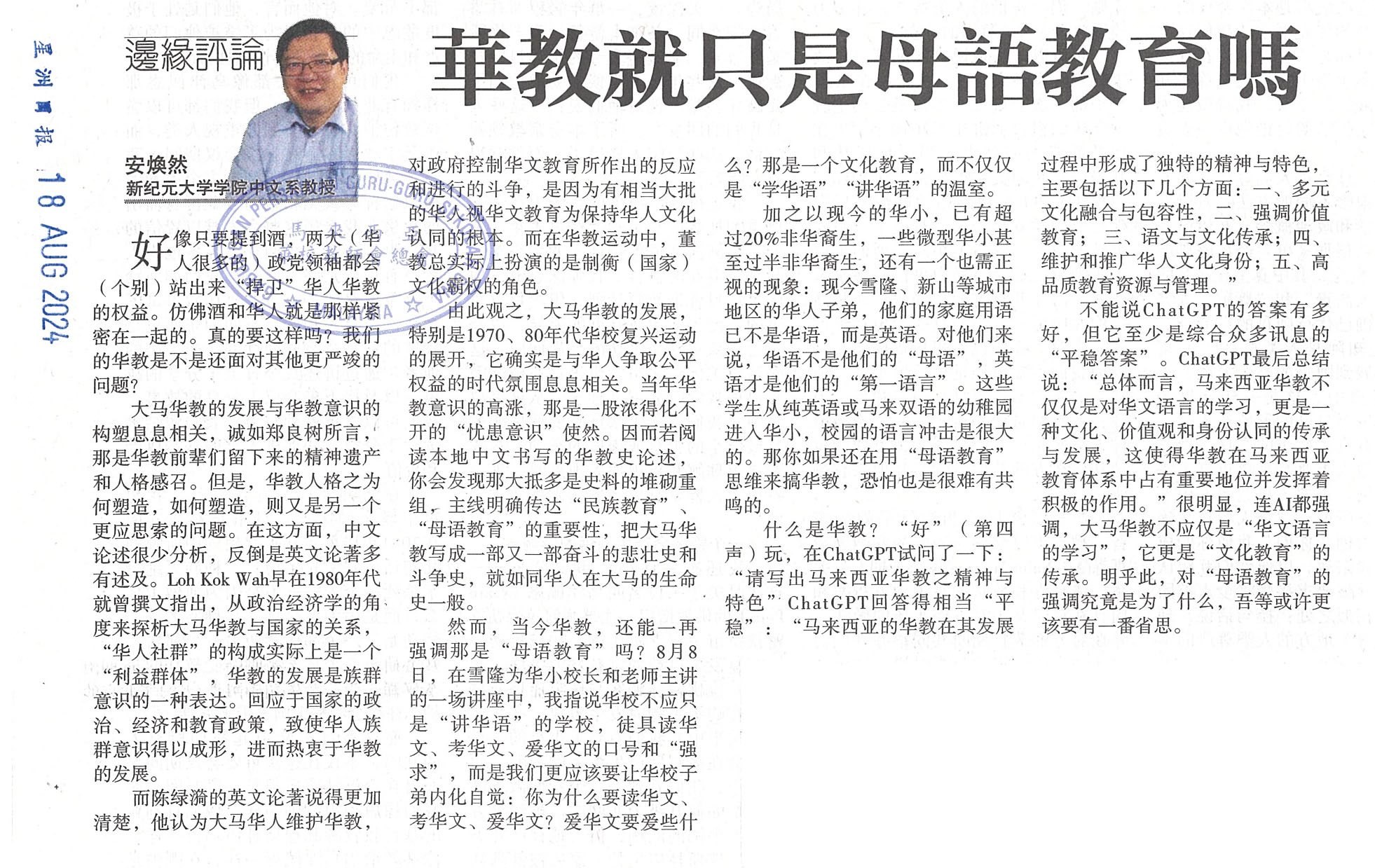 安焕然教授.华教就只是母语教育吗 WhatsApp 上一篇文章: 郭史光宏:“学生阅读计划”:回到本质 回到人与书的联结 上一页 下一篇文章: 郭史光宏:“学生阅读计划”:失焦的指南针永远走不到目的地 下一页