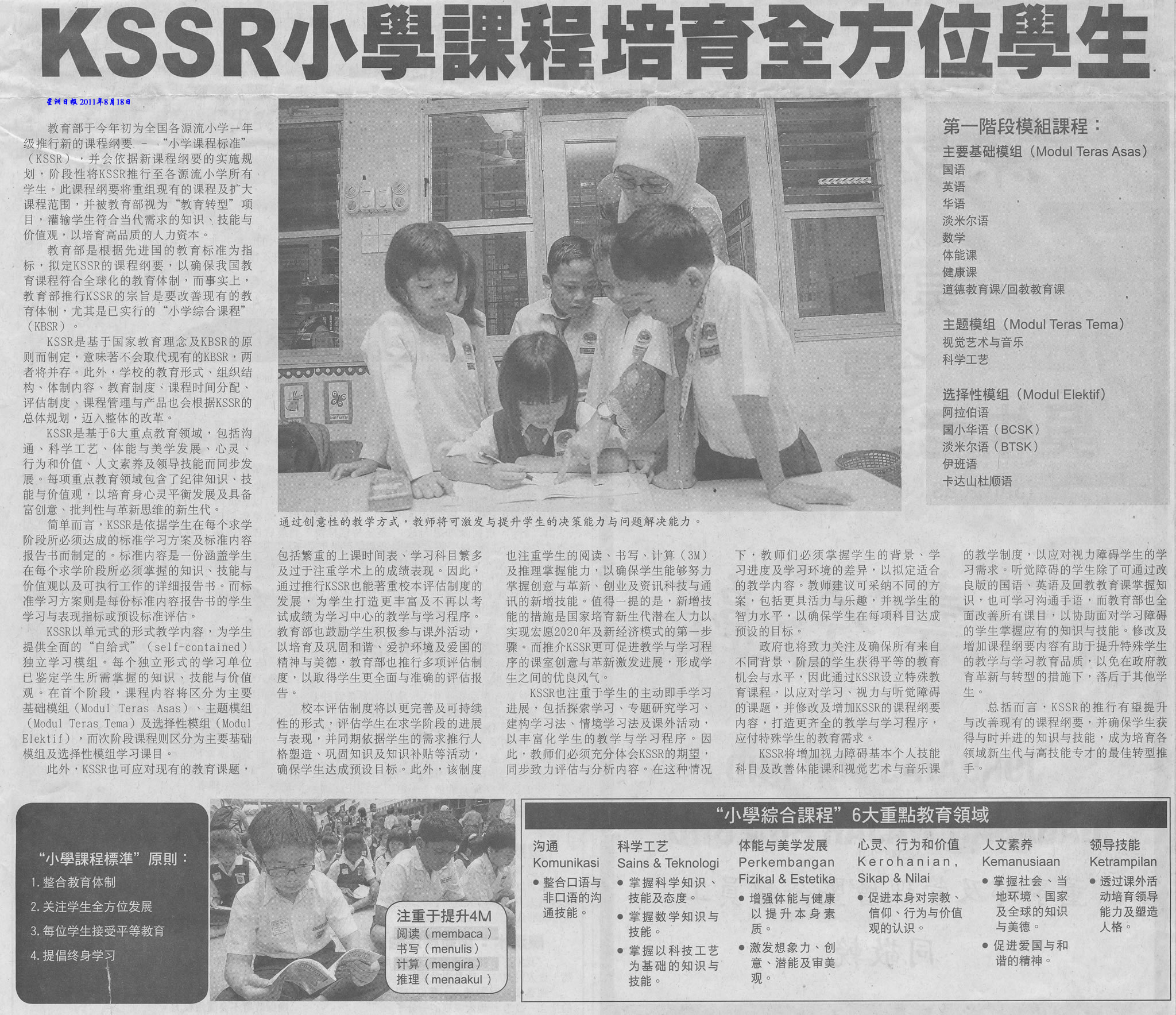 教育部于今年初为全国各源流小学一年级推行新的课程纲要