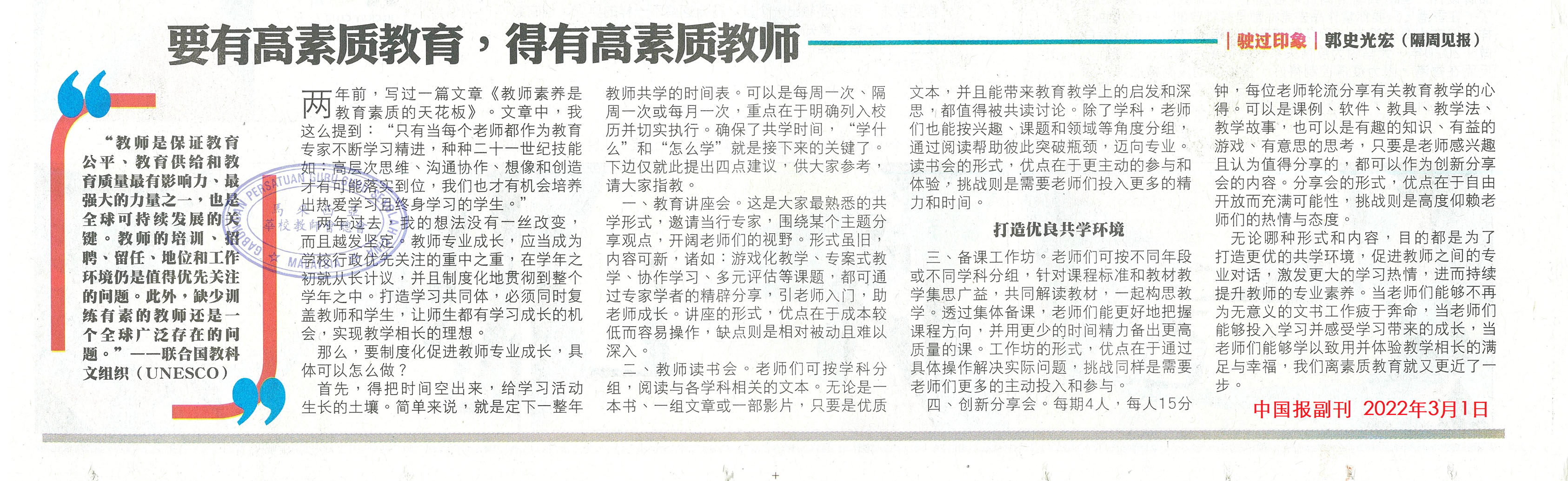 郭史光宏:要有高素质教育,得有高素质教师|