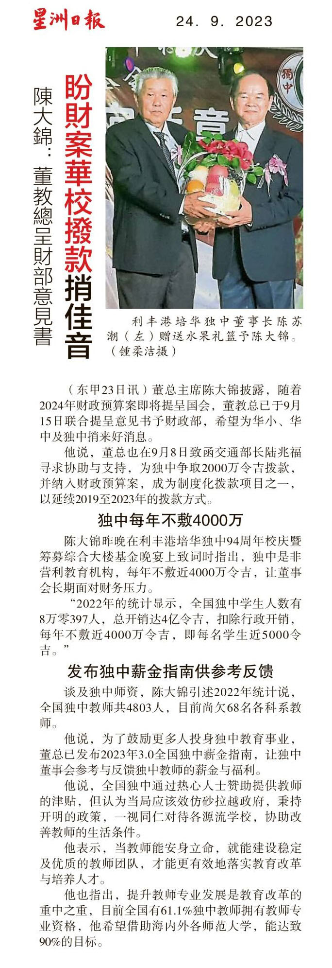 陈大锦:董教总呈财政部意见书 盼财案华校拨款捎佳音 WhatsApp 上一篇文章: 拉杭华小设特殊教育班 万事俱备只欠“批文" 上一页 下一篇文章: 千人宴庆周年筹建综合大楼 培华独中筹获1487万创记录 下一页
