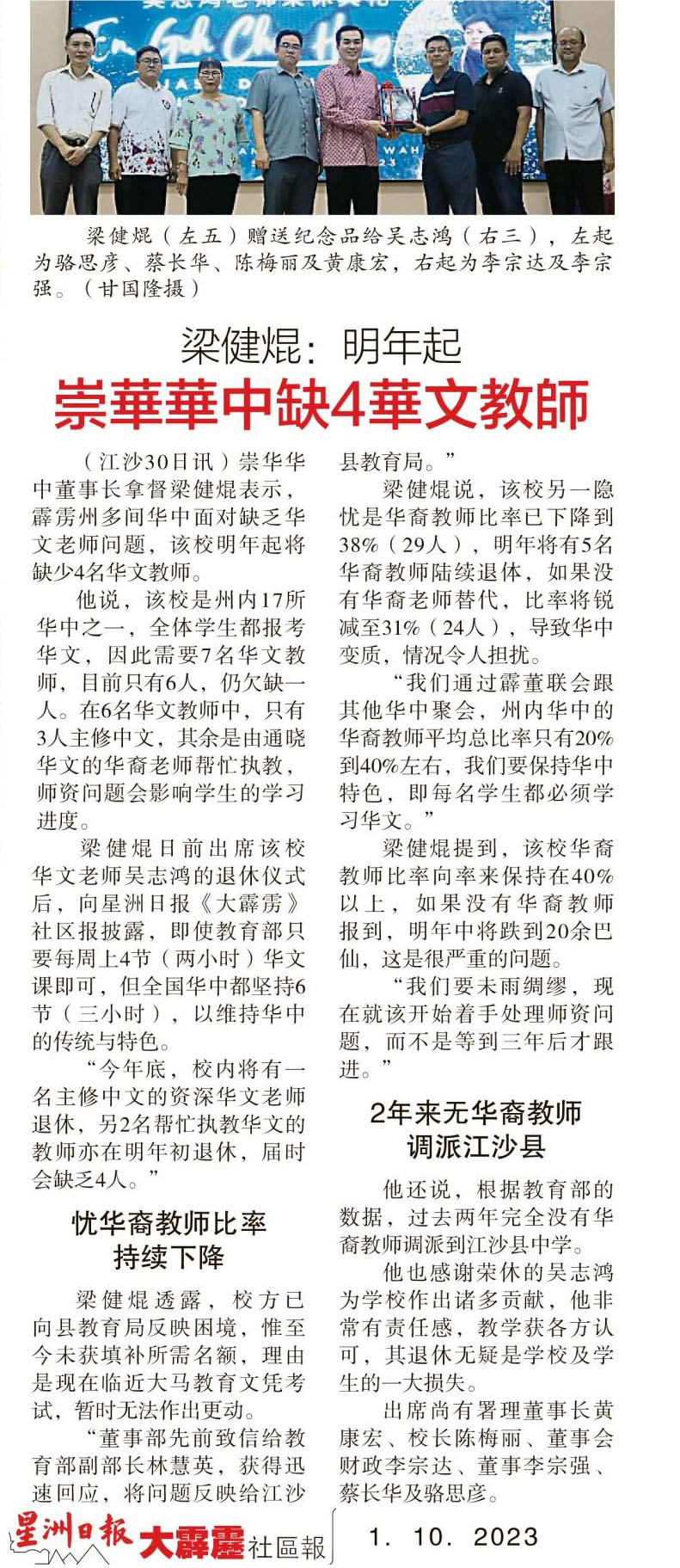 梁建焜:明年起 崇华华中缺4华文教师