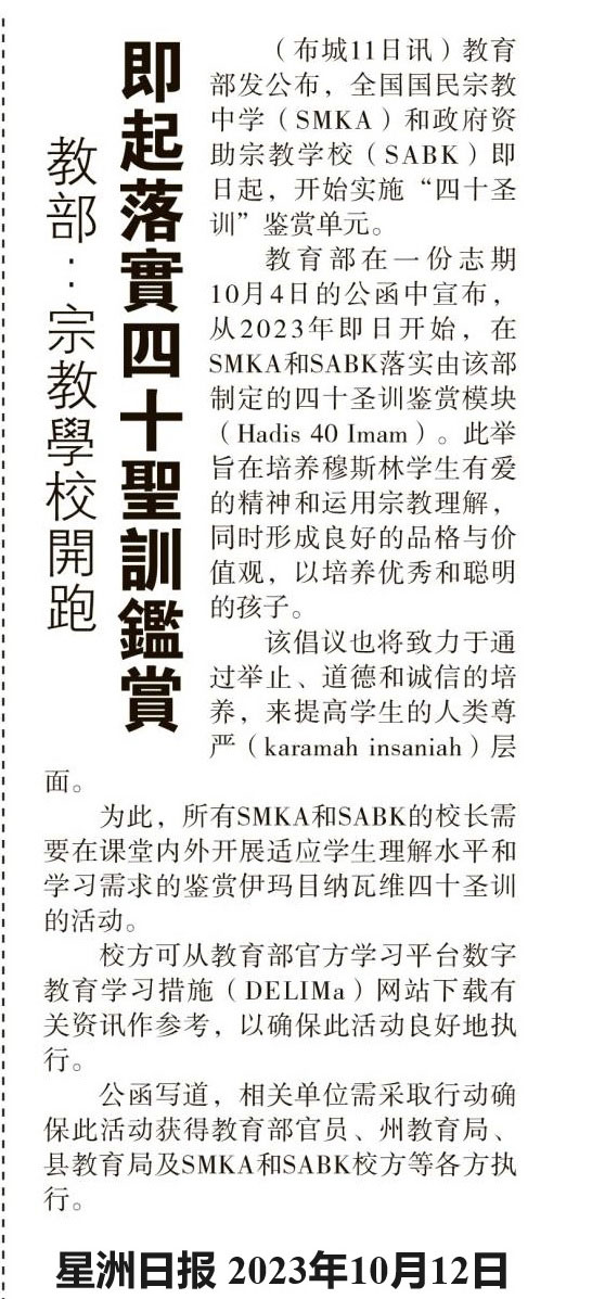 教育部:宗教学校开跑 即起落实四十圣训鉴赏 WhatsApp 上一篇文章: 中國報 今日北马头条◢三民 筹10万 开两班 办特殊教育班 自救 上一页 下一篇文章: 高教部列“具竞争力学府” 南院将申请升格大学 下一页