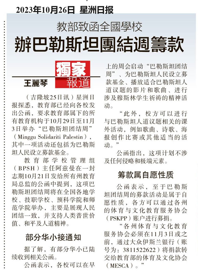 教育部致函全国学校 办巴勒斯坦团结周筹款 WhatsApp 上一篇文章: 爱大华华中 筹建视听室 料耗资120万盼捐助 上一页 下一篇文章: 华中发展理事会:一两班改用国语授课 华中英教数理有变 下一页