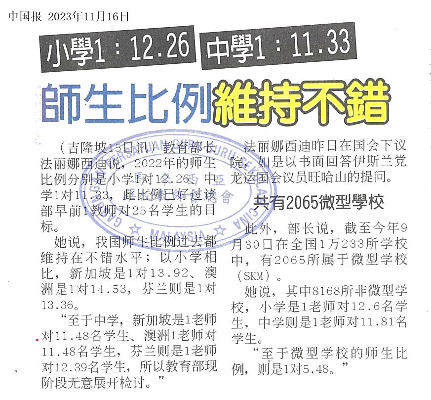 小学 1:12.26 中学1:11.33 师生比例维持不错 WhatsApp 上一篇文章: 教育部长:维持政策 历史及格才获SPM文凭 上一页 下一篇文章: 蔡文铎:行政工作无减轻趋势 压力山大 教师纷求去 下一页