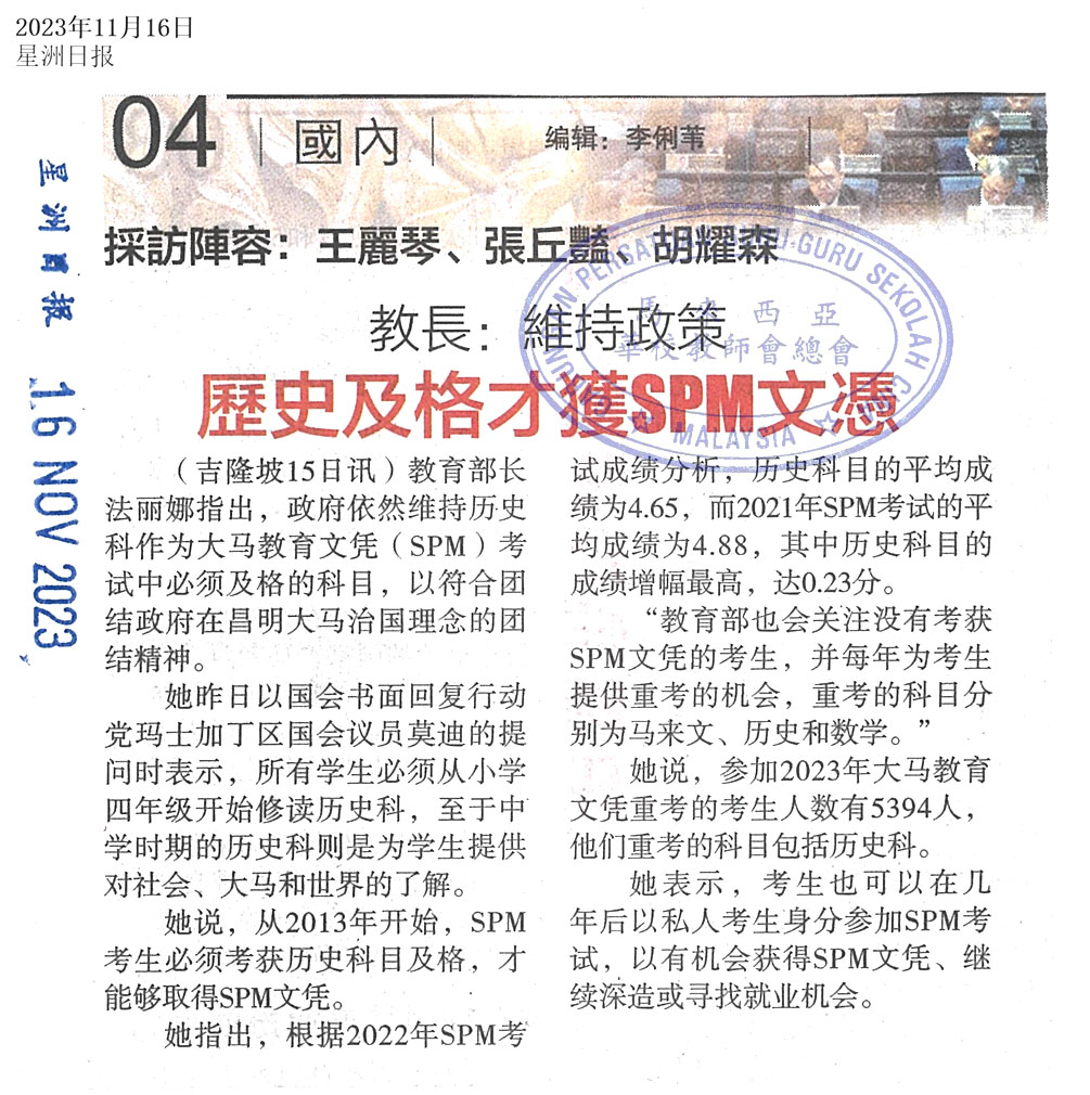 教育部长:维持政策 历史及格才获SPM文凭 WhatsApp 上一篇文章: 教长:未来五年无需培训 华淡科师资足 上一页 下一篇文章: 小学 1:12.26 中学1:11.33 师生比例维持不错 下一页