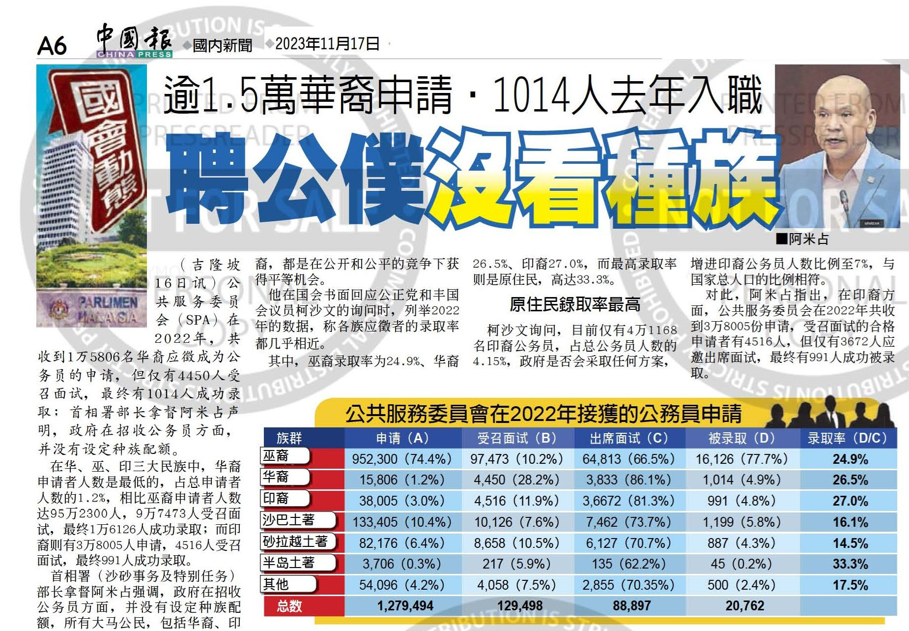 逾1.5万华裔申请 . 1014人去年入职 聘公仆没看种族