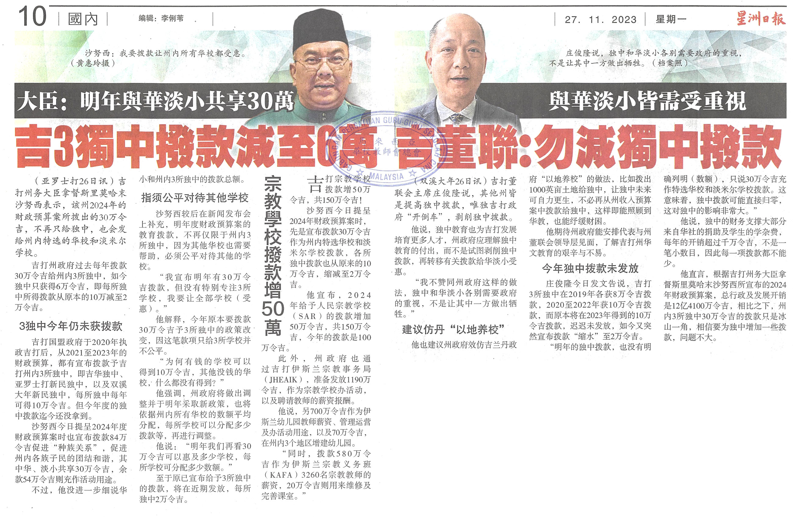 大臣:明年与华淡小共享30万 吉打3独中拨款减至6万