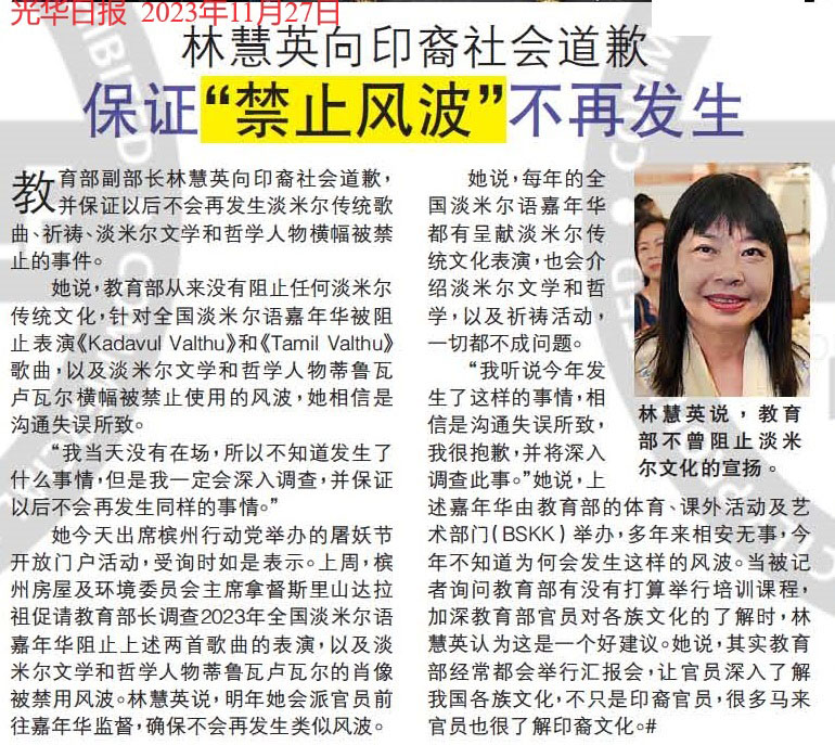林慧英向印裔社会道歉 保证“禁止风波”不再发生