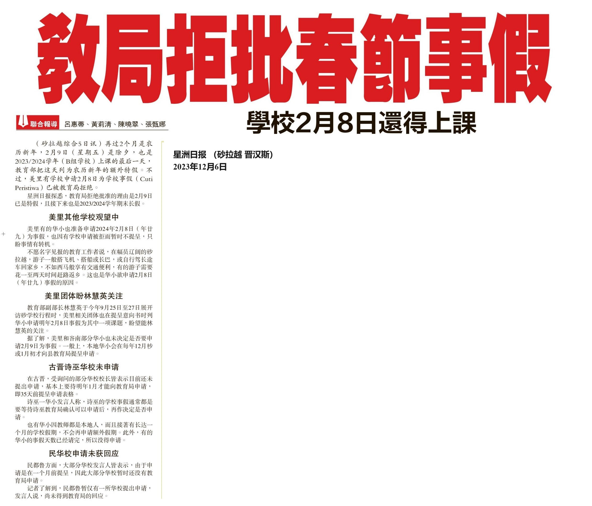申请2月8春节事假  砂部分华小不获批