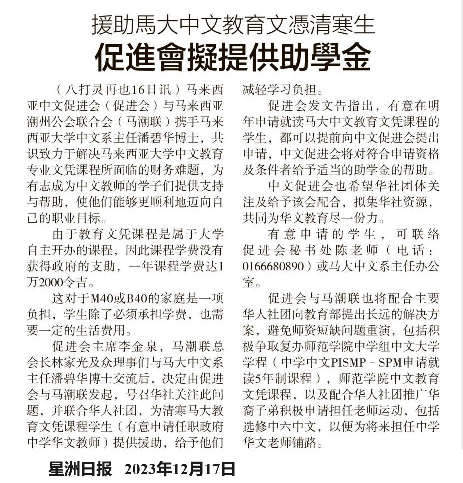 援助马大中文教育文凭清寒生 促进会拟提供助学金