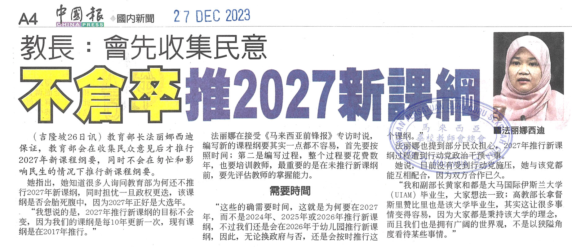 教长:会先收集民意 不仓卒推2027新课纲