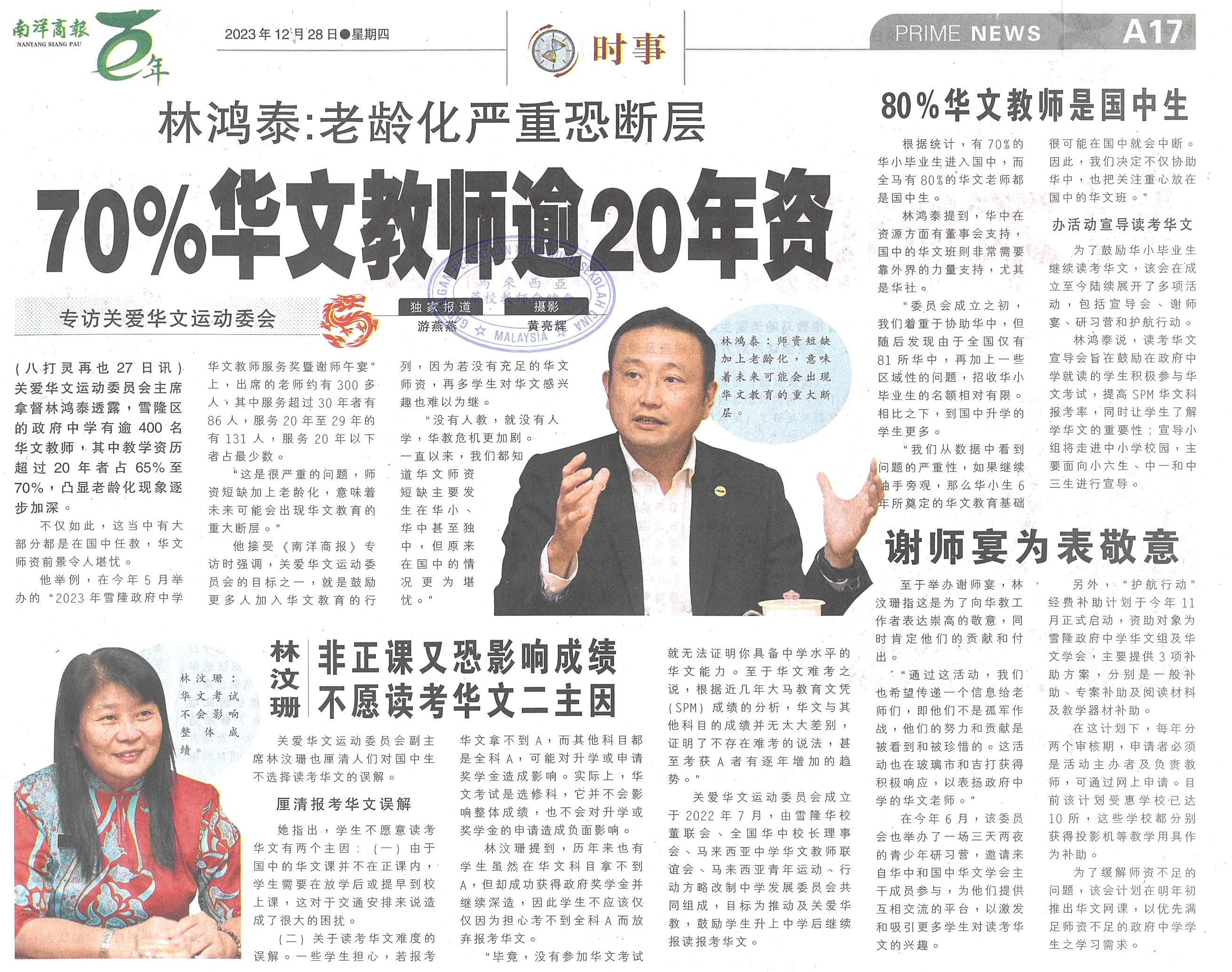 林鸿泰:老龄化严重恐断层 70%华文教师逾20年资