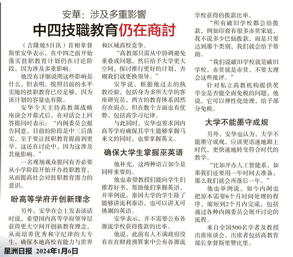 安华:涉及多重影响 中四技职教育仍在商讨