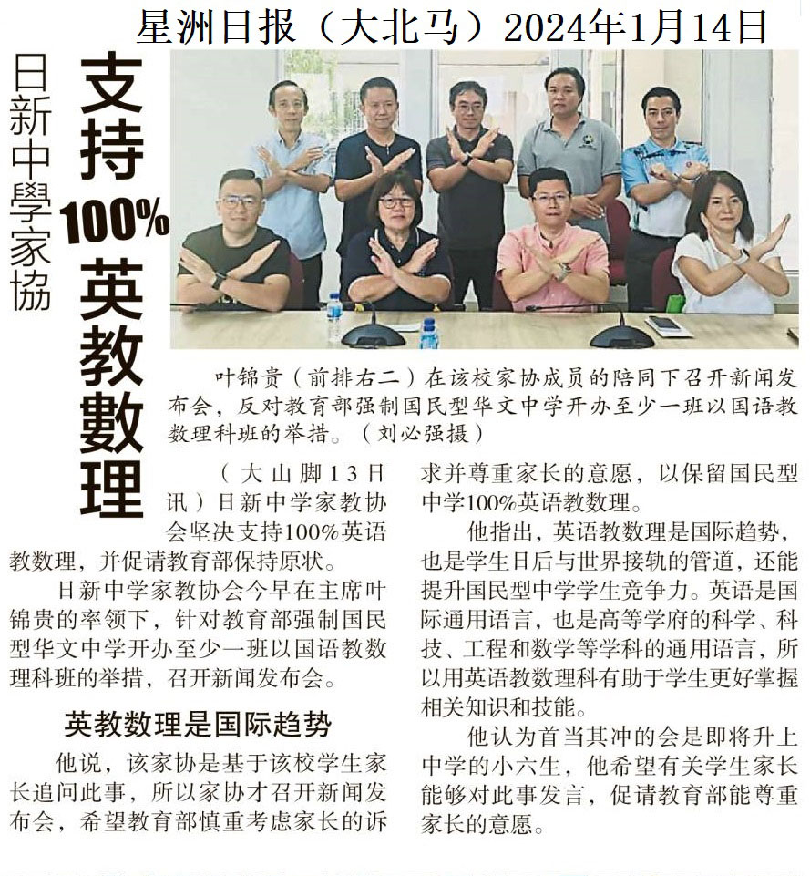 日新中学家协 支持100%英语教数理