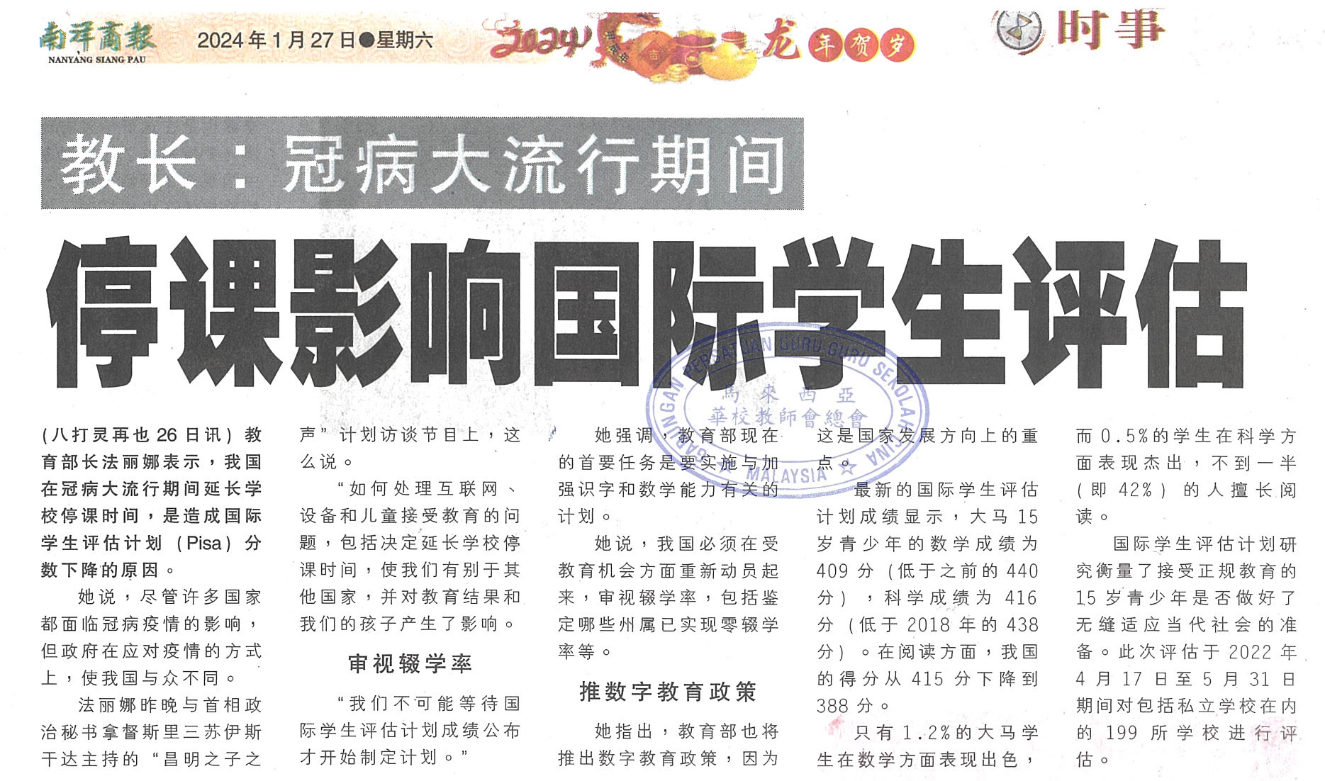教育部长:冠病大流行期间 停课影响国际学生评估 WhatsApp 上一篇文章: 教育部长:过半已解决 东马1069校失修693修复 上一页 下一篇文章: 12毕业 3搬迁 11新生报读 美丽敦华小学生剩69人 下一页
