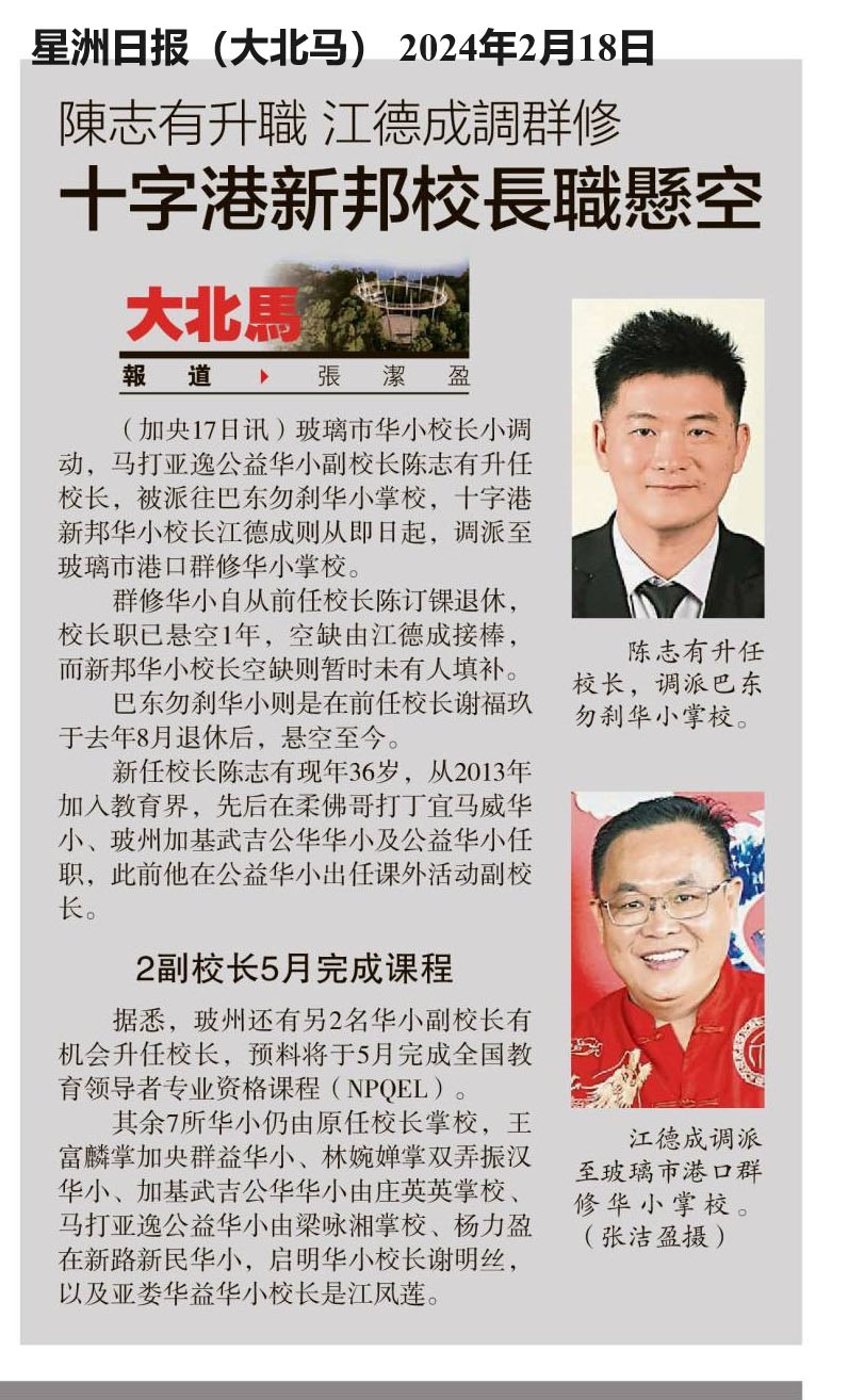陈志有升职 江德成调群修 十字港新邦校长职悬空 WhatsApp 上一篇文章: 滨华分校校地变小 黄瑞林:董事长促换地点 上一页 下一篇文章: 王鸿财:提升素质招收友族生 生育率低不影响整体华小 下一页