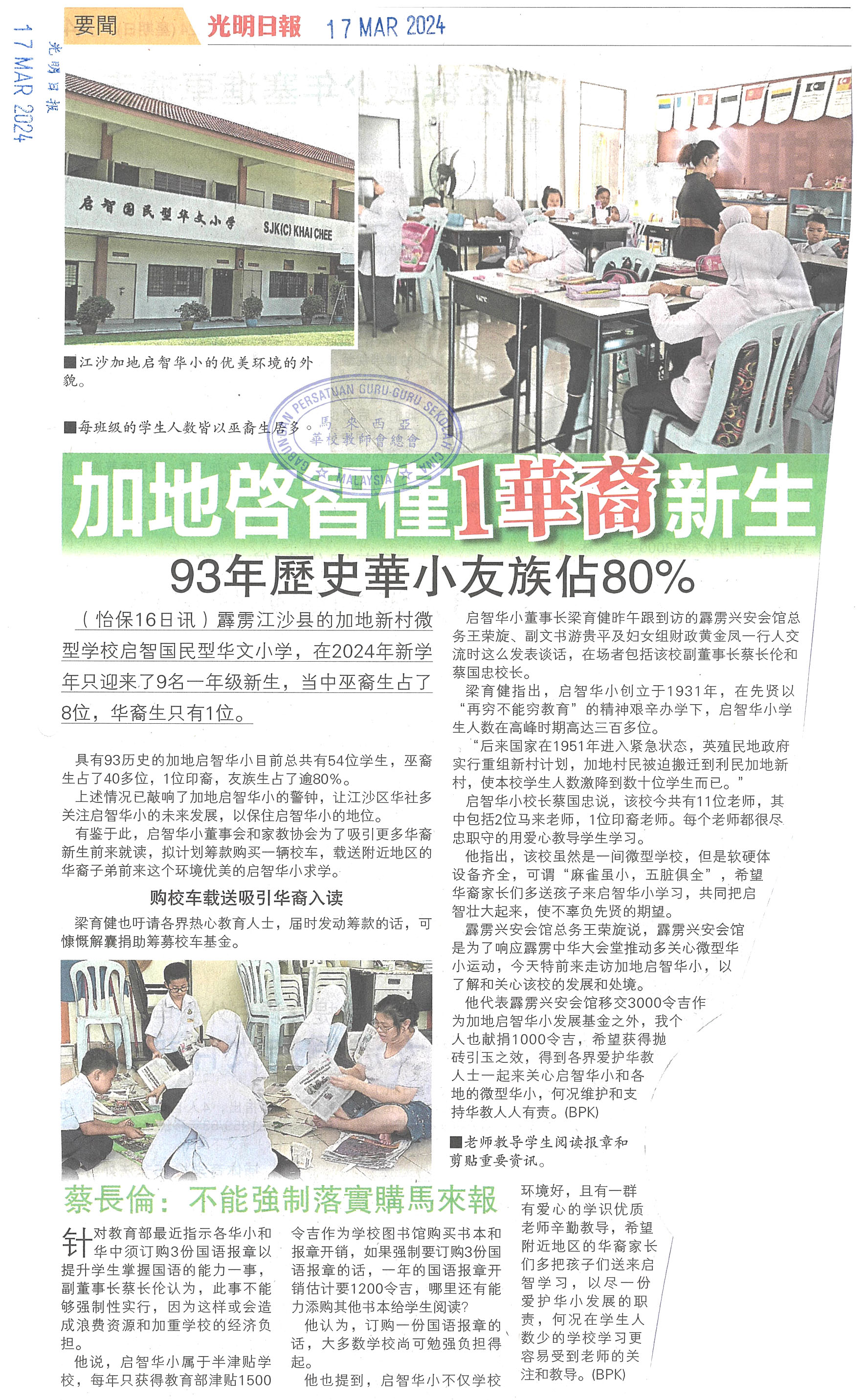 加地启智仅1华裔新生 93年历史华小友族占80% WhatsApp 上一篇文章: 新校舍未能启用或明年搬迁 呀吃18哩中华华小原校上课 上一页 下一篇文章: 教育部长警告教职员勿性骚学生 “你碰了就滚!” 下一页