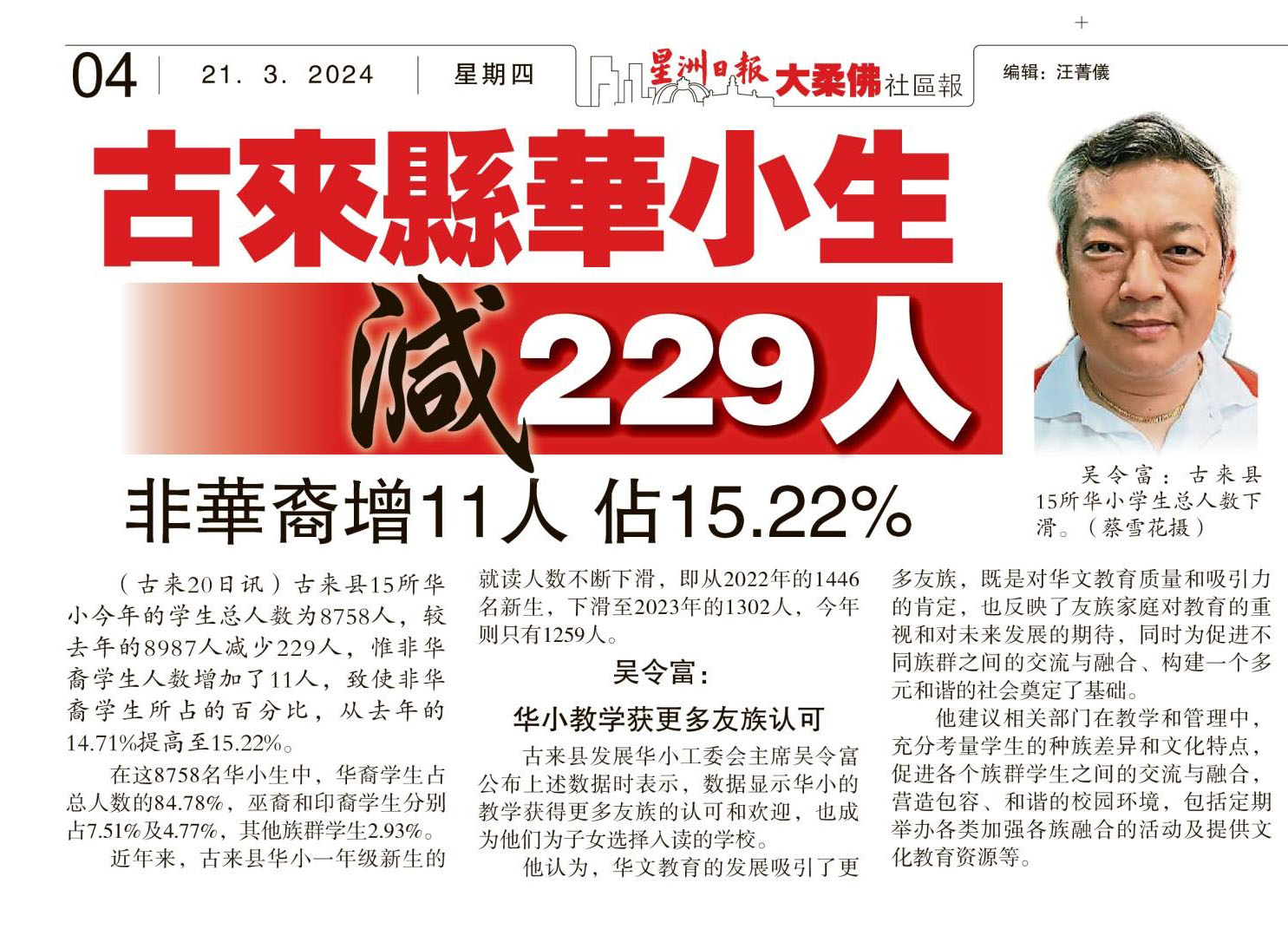 古来县华小学生减229人 非华裔增11人 占15.22% WhatsApp 上一篇文章: 江新源:非华裔居多 玛都中华 30小一新生 上一页 下一篇文章: 拉务八哩新村华小迎6新生 黄亚添赞助每人500奖励金 下一页