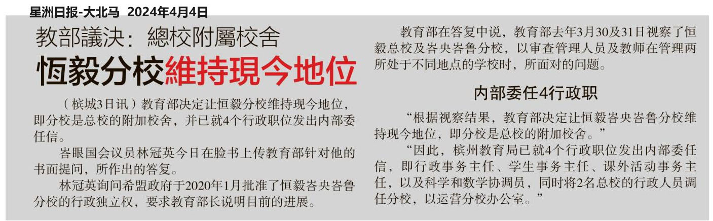 教育部议决:总校附属校舍 恒毅分校维持现今地位 WhatsApp 上一篇文章: 副高教部长:政府拨2000万 马首所AI学院503开幕 上一页 下一篇文章: 法丽娜:解决短缺问题 近期公布教师招聘人数 下一页