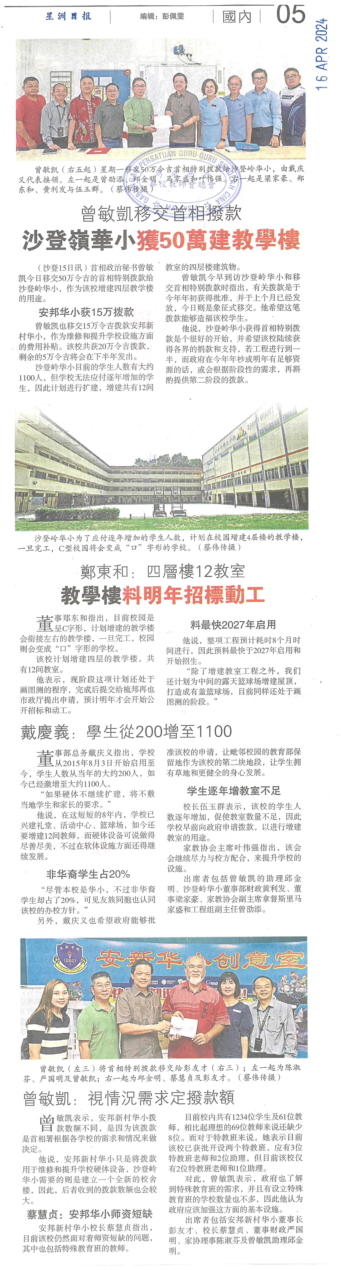 曾敏凯移交首相拨款 沙登岭华小获50万建教学楼 WhatsApp 上一篇文章: 黄家和:一些将迁校 今年没微小被关闭 上一页 下一篇文章: PISMP招生范围扩至STPM预科班生 谢立意:招生资格扩大仅限国小组争取明年开放各源流 下一页