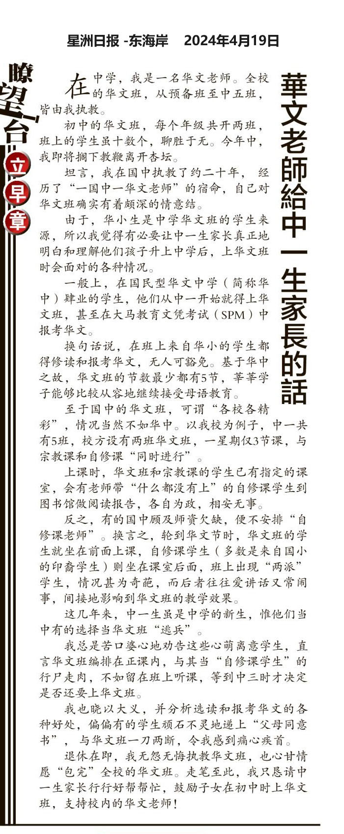 华文老师给中一生家长的话