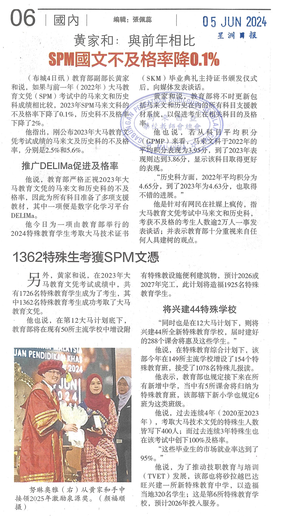 黄家和:与前年相比  SPM国文不及格率降0.1%