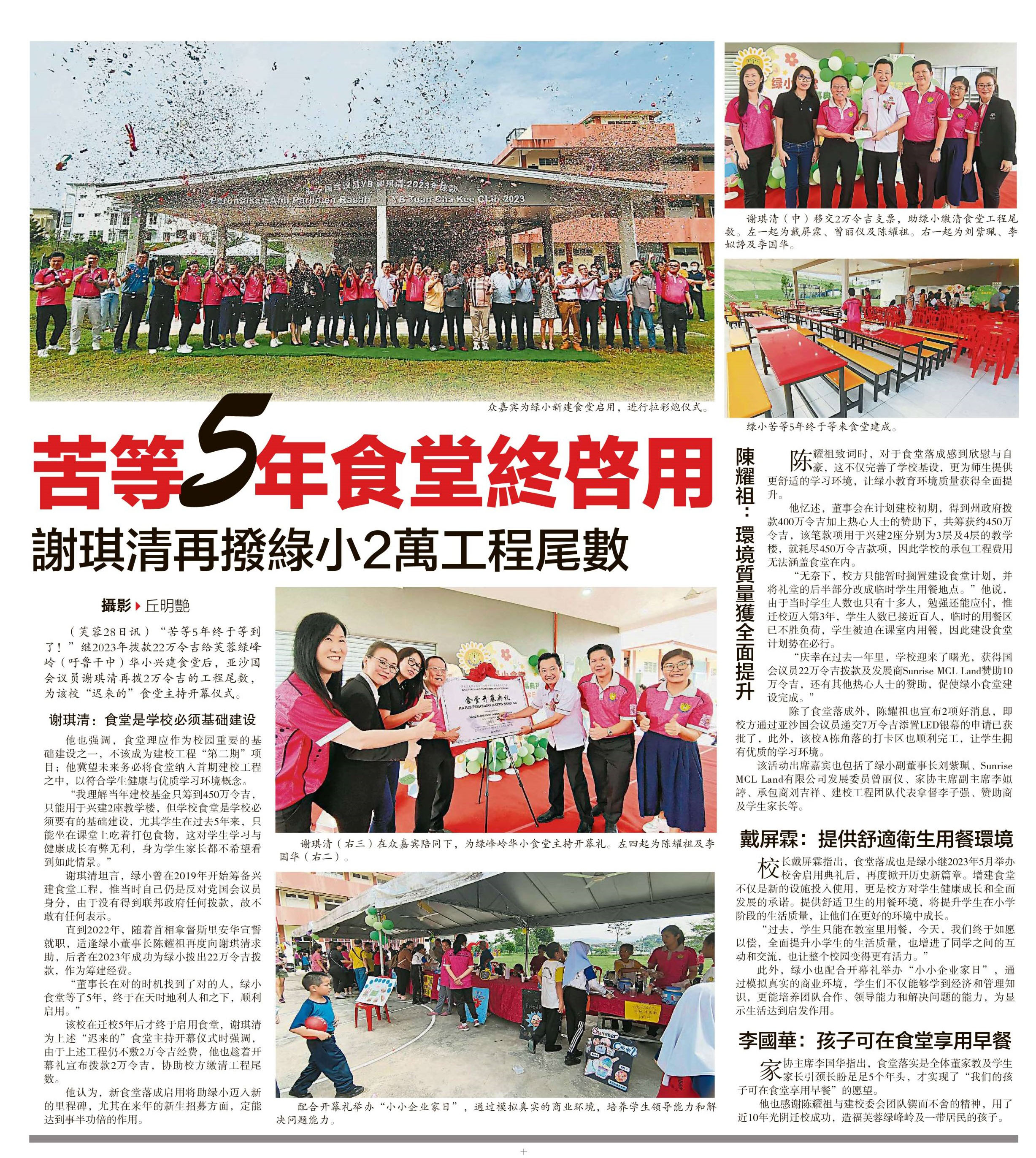 苦等5年食堂终启用 谢琪清再拨绿小2万工程尾数