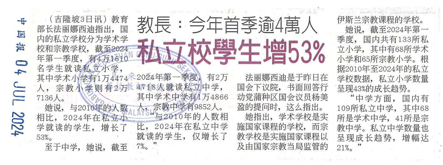 教长:今年首季逾4万人 私立校学生增53%