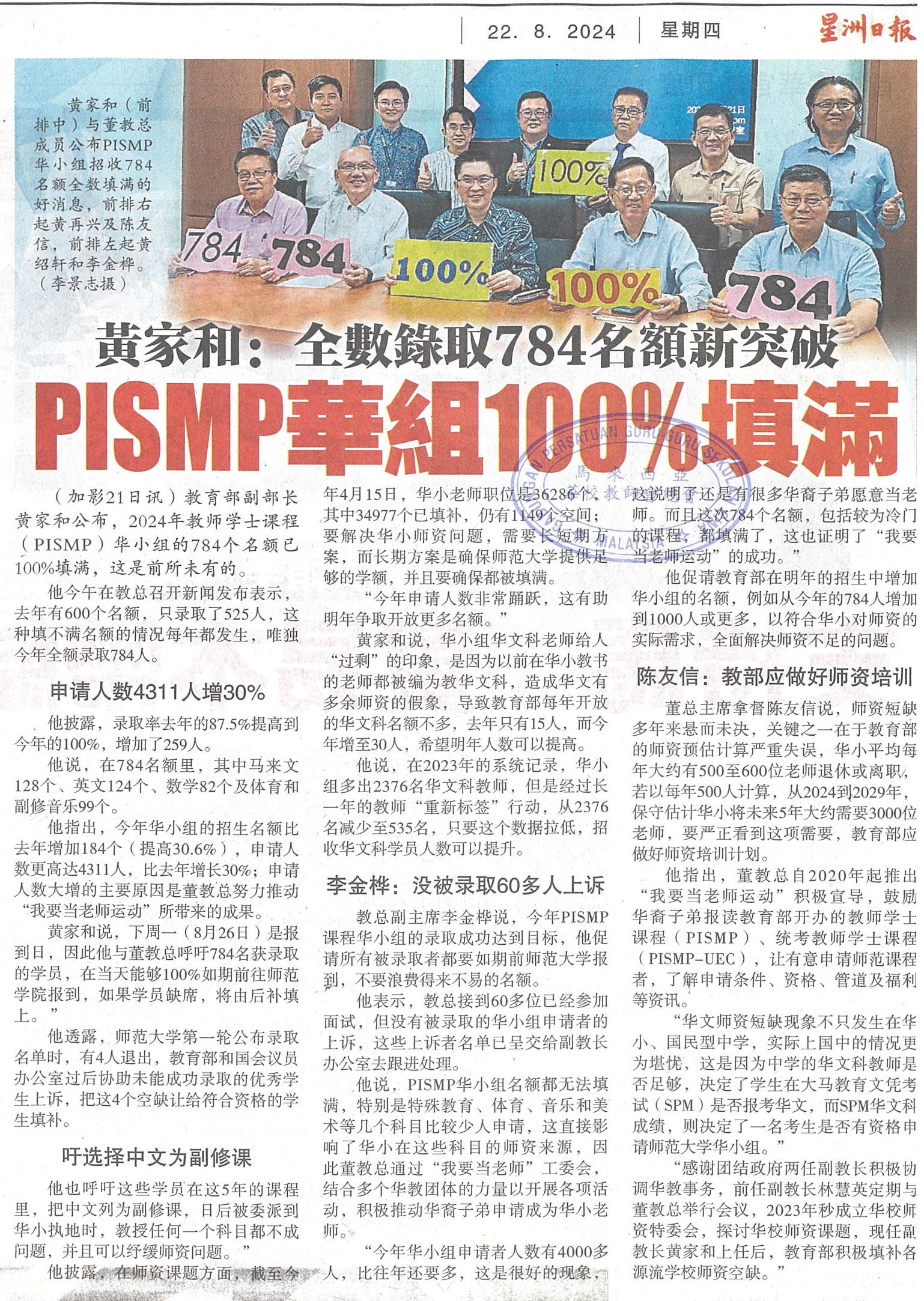 黄家和:全数录取784名额新突破  PISMP华组100%填满