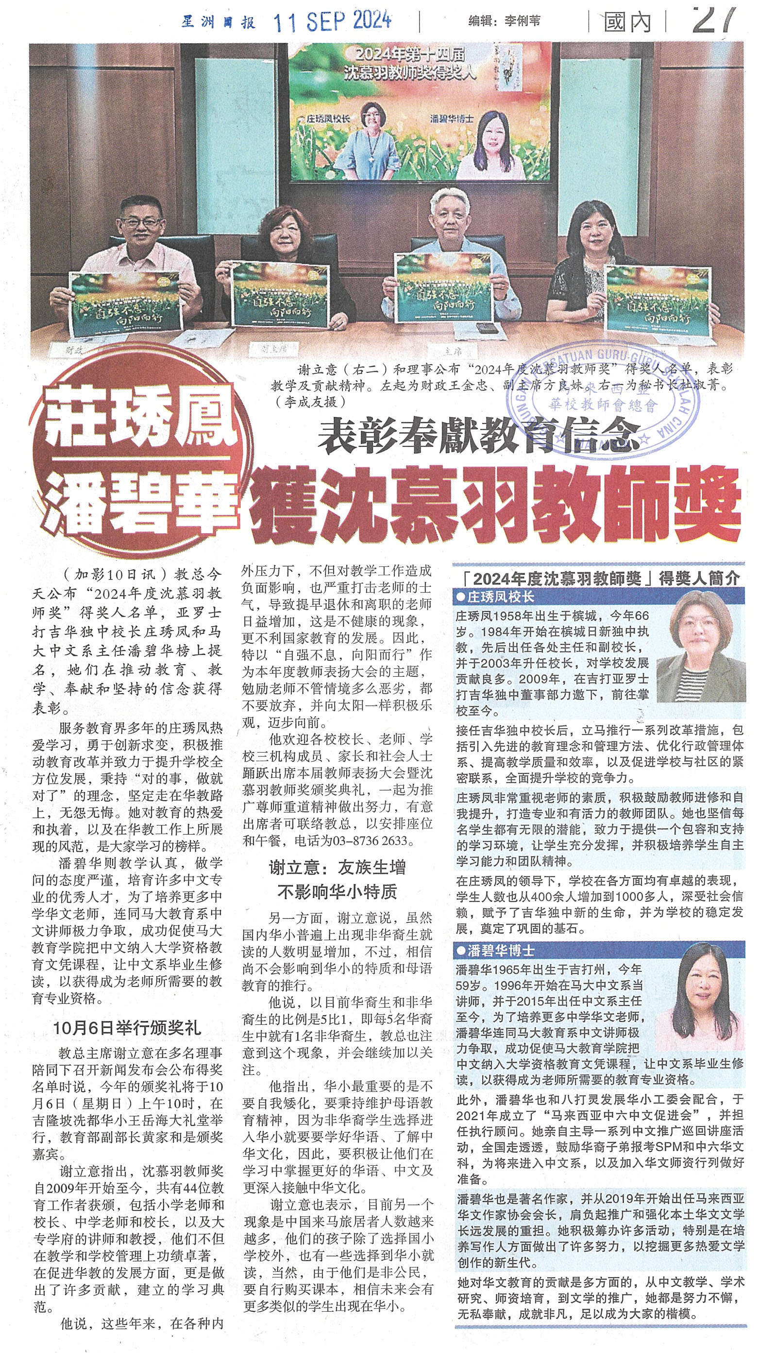 表彰奉献教育信念 庄琇凤 潘碧华获沈慕羽教师奖