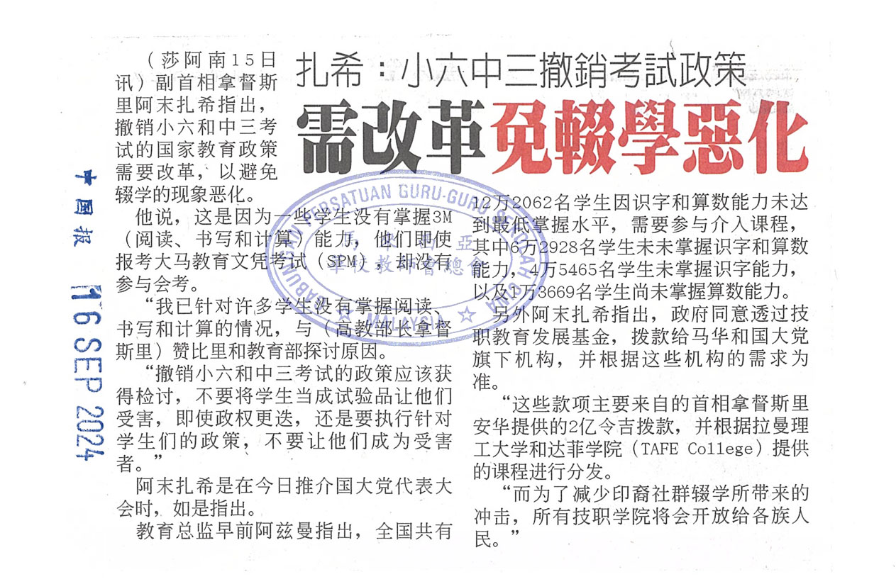 扎希:小六中三撤销考试政策 需改革免辍学恶化