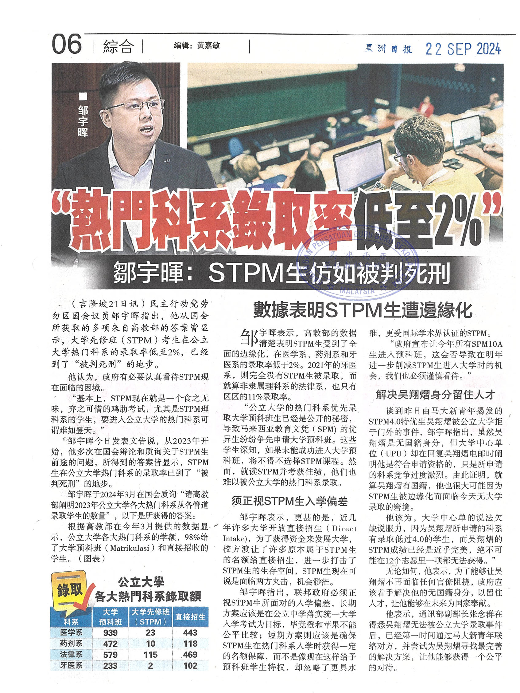 “热门科系录取率低至2%” 邹宇晖:STPM生仿如被判死刑