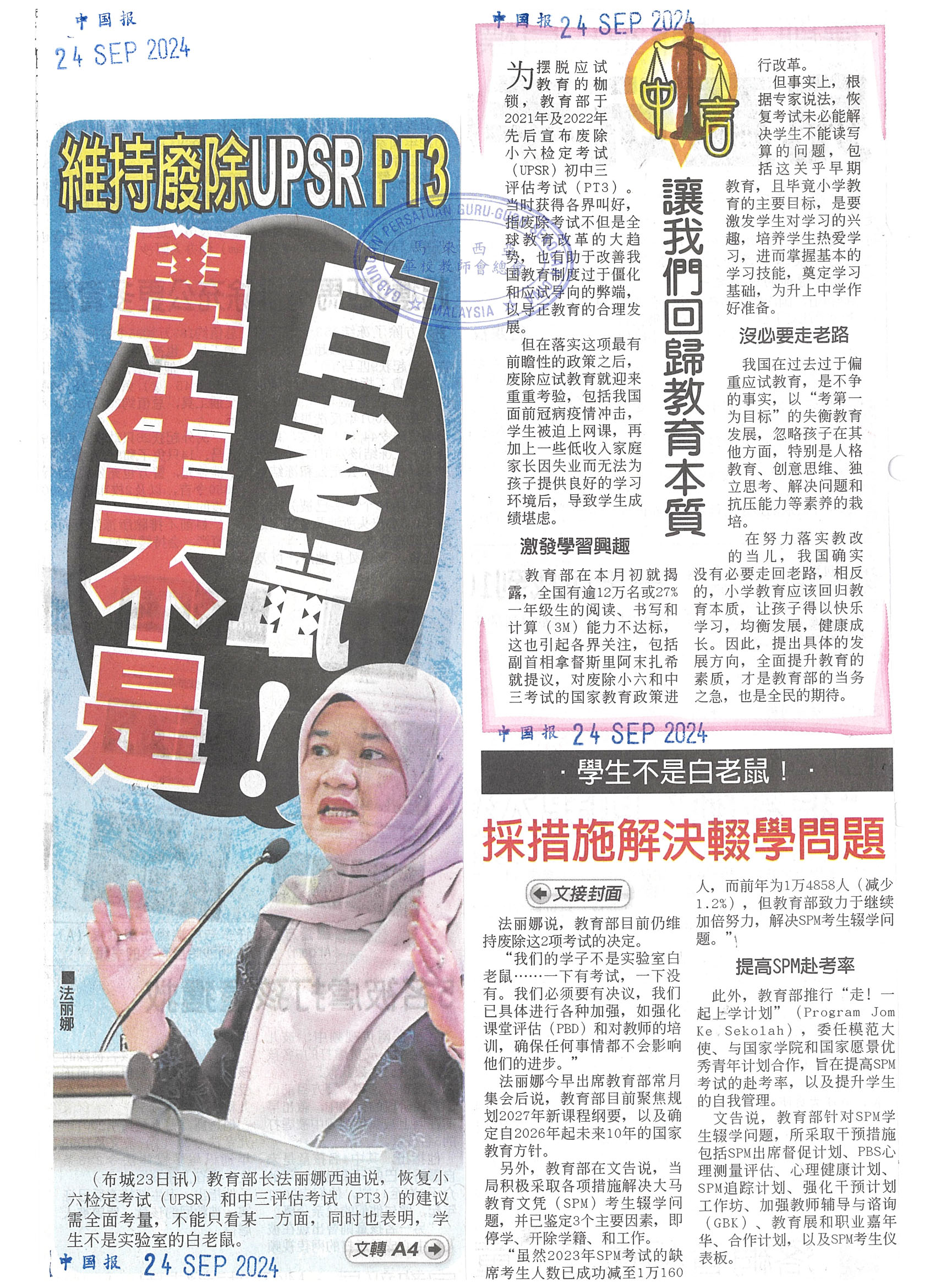 维持废除UPSR PT3 学生不是白老鼠
